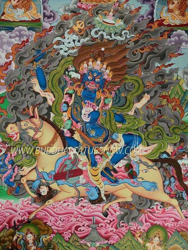 Palden Lhamo is classed as a “Shri Devi” which is a type of fierce female protector of Tibetan Buddhism. Additionally, she is included as one of the eight great Dharmapala which is a Sanskrit term for “Dharma protector or defender”. These fierce wrathful deities certainly have a ferocious reputation and appearance.