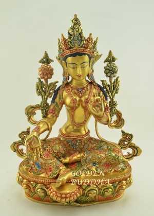 Fully Gold Gilded 14 Masterpiece Green Tara Sculpture, Hand Carving, Embedded Stones – 420px