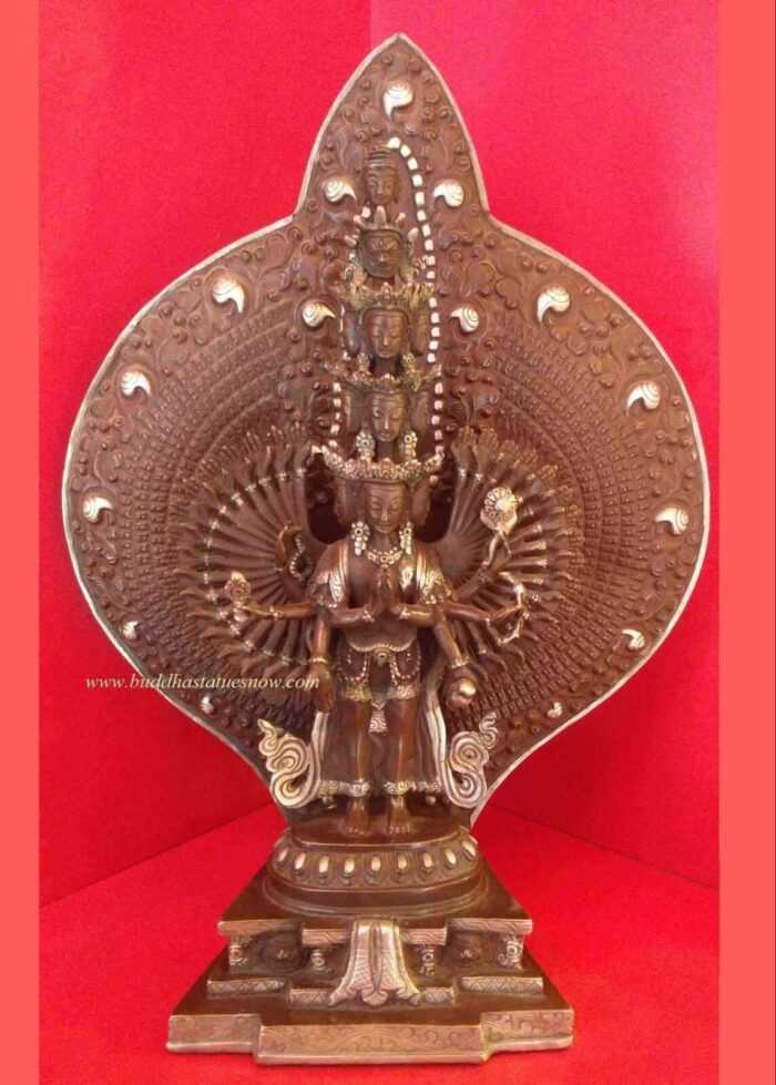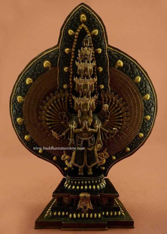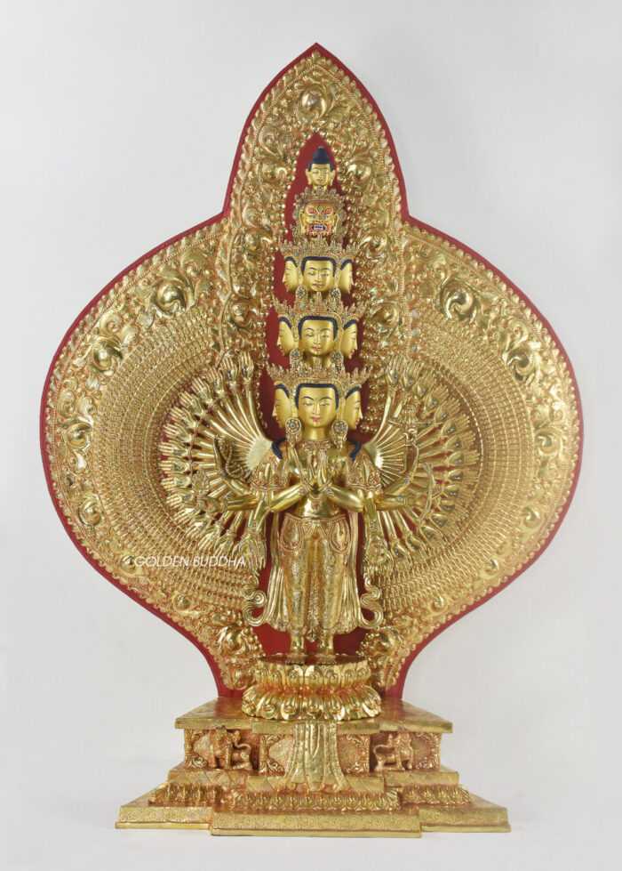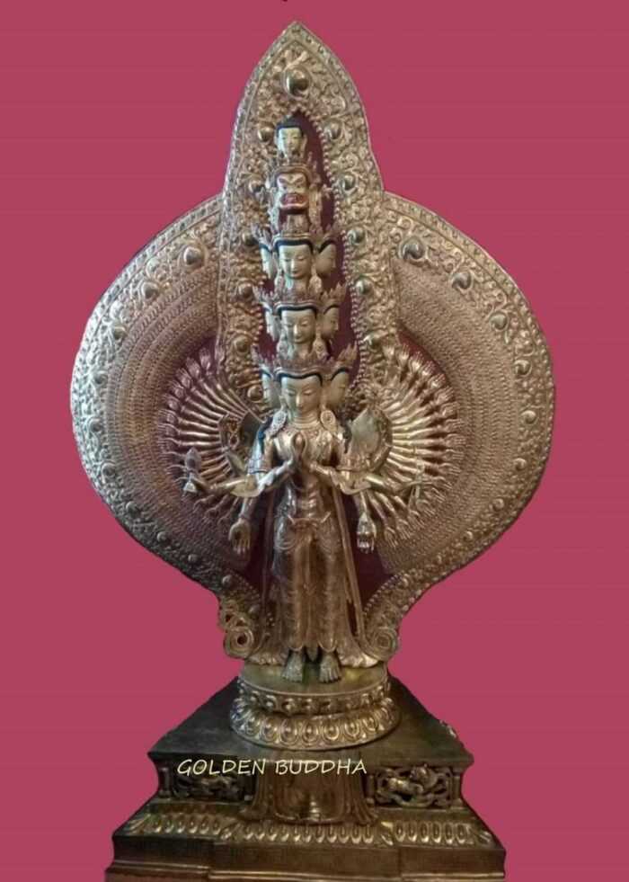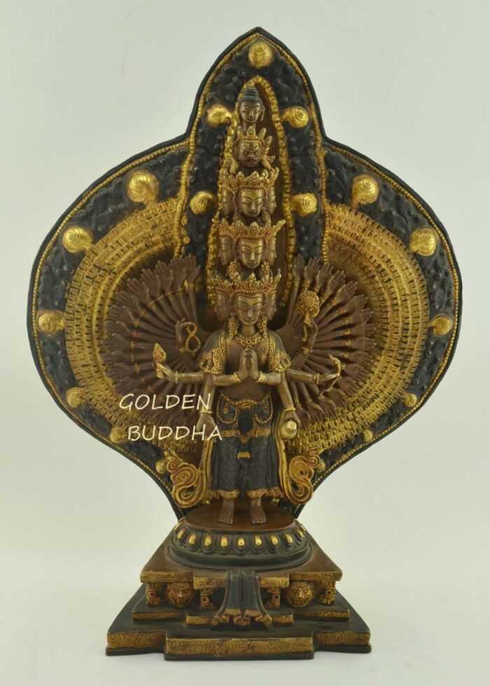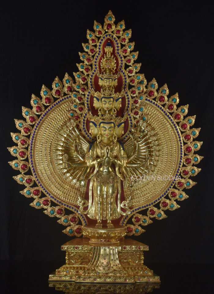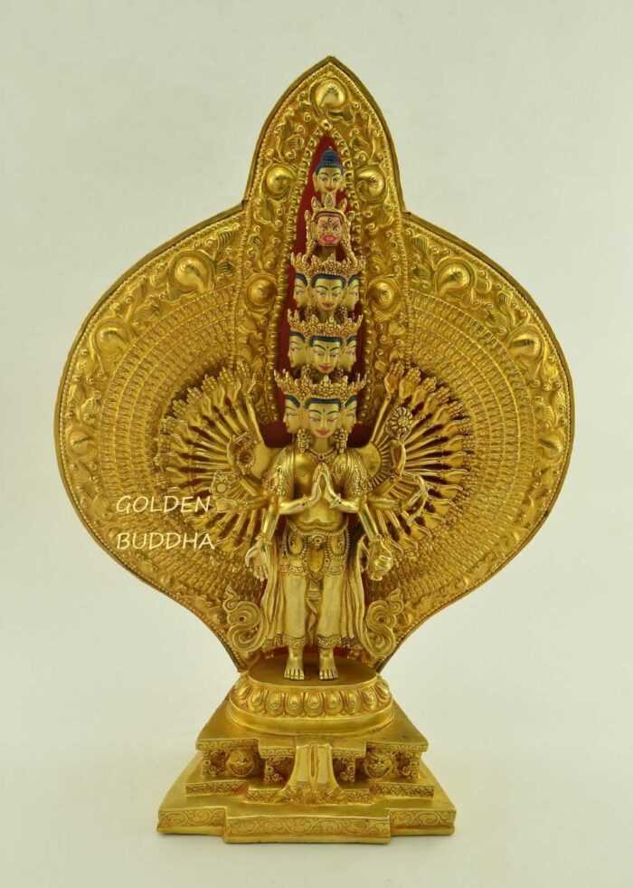 All of our 1000 armed Avalokiteshvara statues were hand crafted in Nepal using the traditional lost wax sculpting method. Each statue was then fire gilded with a 24K gold finish. Rest assured that you have procured a monastic quality sculpture. Choose yours from our gallery below.