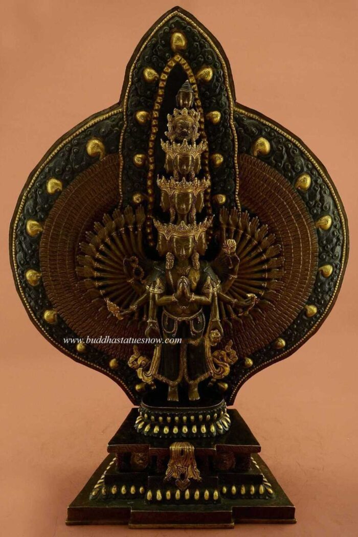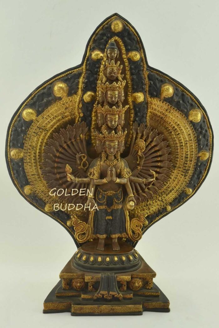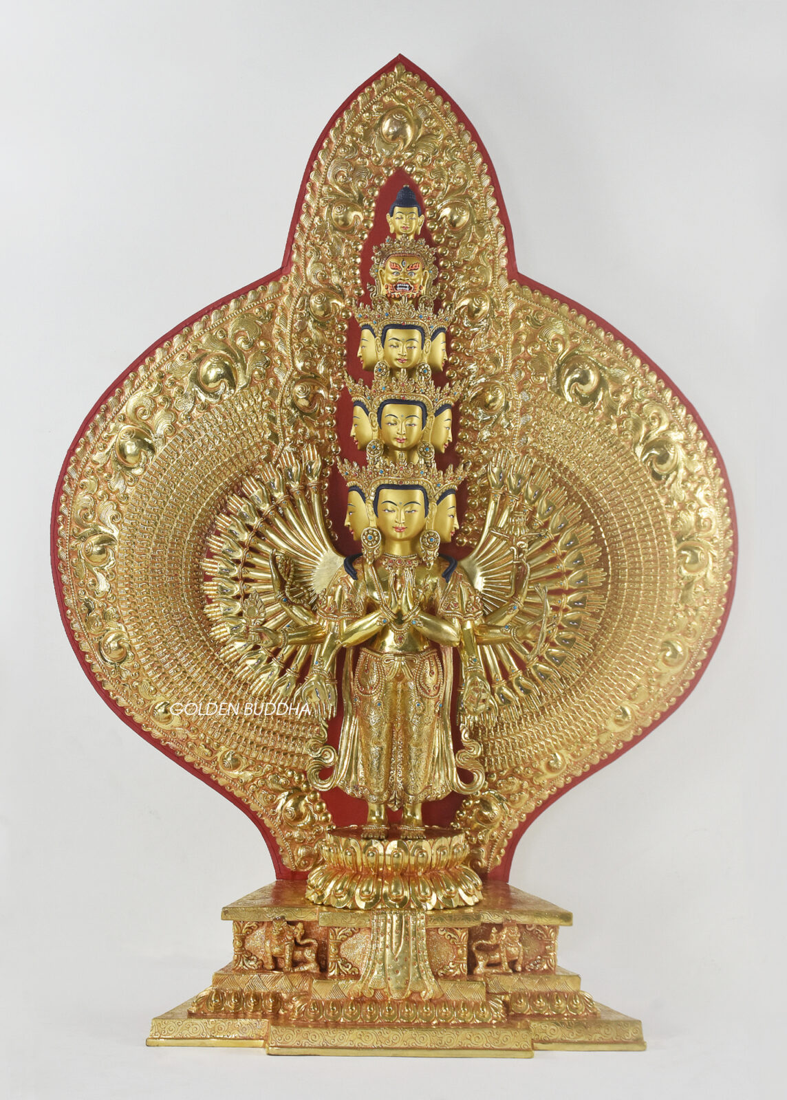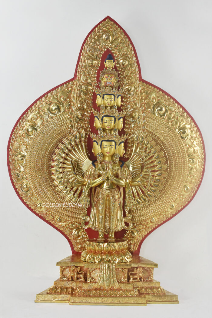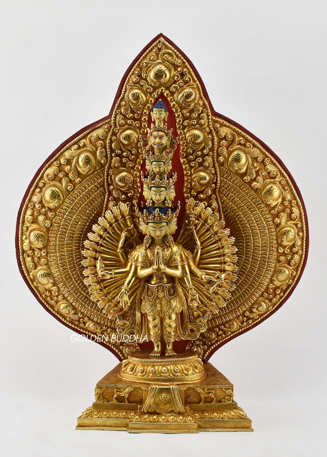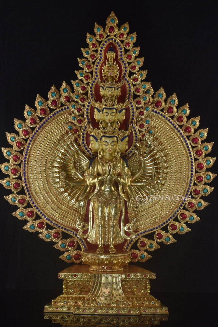 All of our 1000 armed Avalokiteshvara statues were hand crafted in Nepal using the traditional lost wax sculpting method. Each statue was then fire gilded with a 24K gold finish. Rest assured that you have procured a monastic quality sculpture. Choose yours from our gallery below.