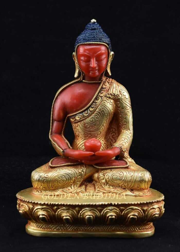 Gold Plated 5.75″ Opame Amitabha Statue, Handmade, Red Coral Paste