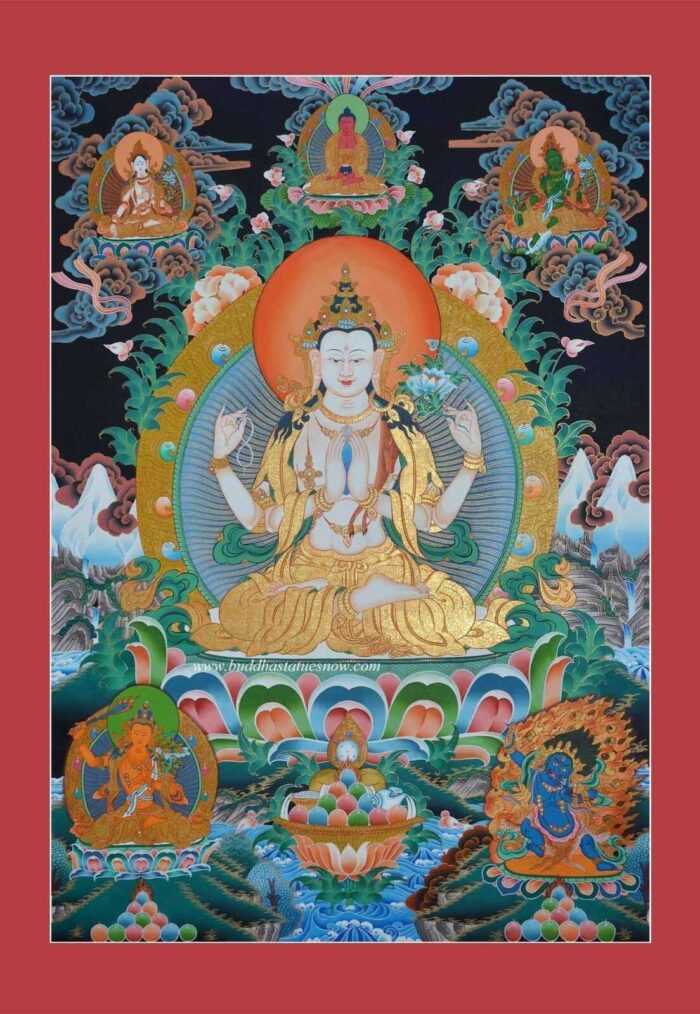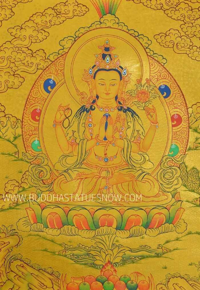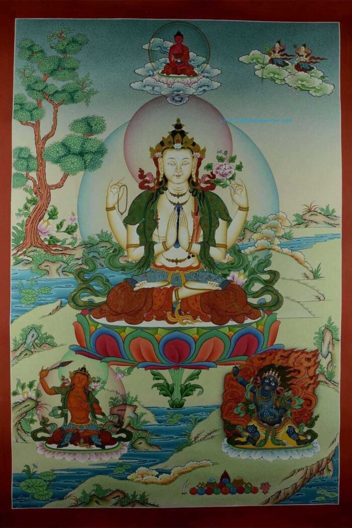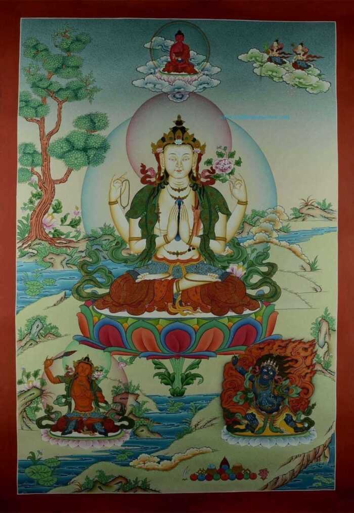 The most beautiful depictions of Avalokiteshvara are found in our Chenrezig Tibetan thangkas. Indeed, Chenrezig is depicted with all the traditional symbols, mudras and postures. Additionally, the traditional symbols and depictions are outlined with 24k gold detailing. Avalokiteshvara is the bodhisattva of compassion who is beloved in all Buddhist counties. Chenrezig is the Tibetan Avalokiteshvara who is revered by all Tibetan Buddhists. As a result, the Nepali painters are specially trained to create Tibetan thangkas with high quality and precision. When you purchase one of our authentic Chenrezig thangkas you can rest assured you have procured monastic quality Tibetan art.