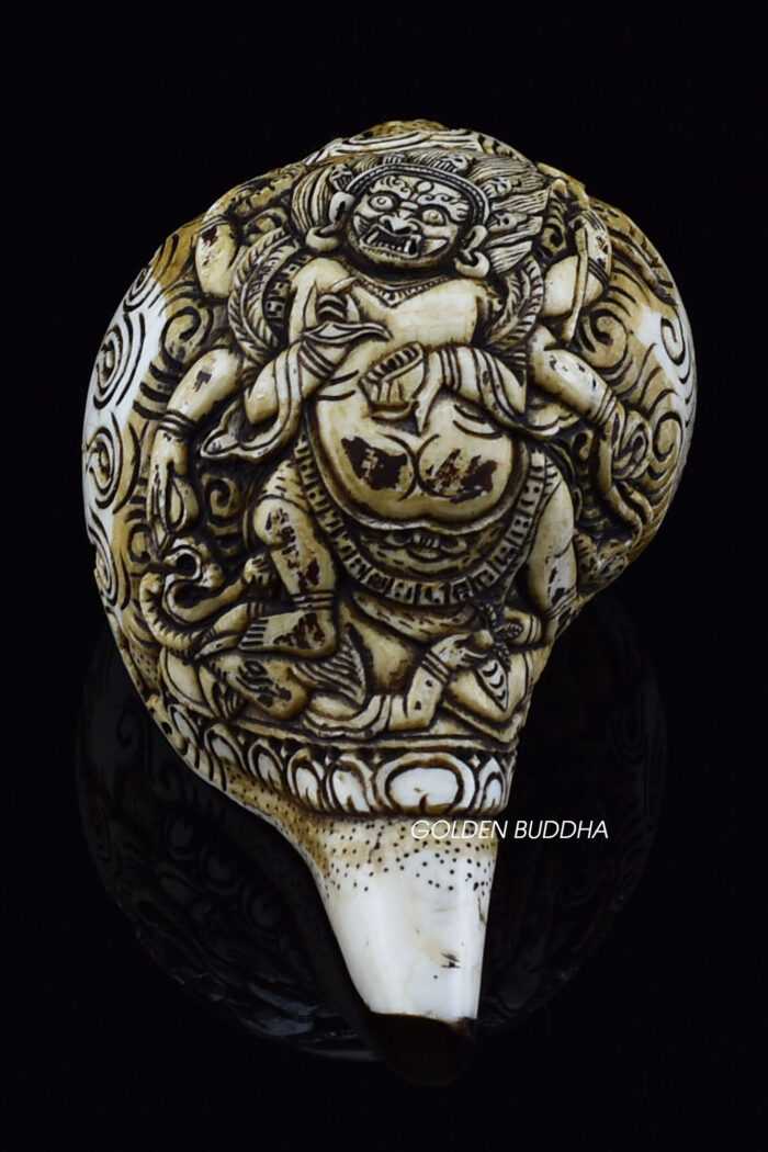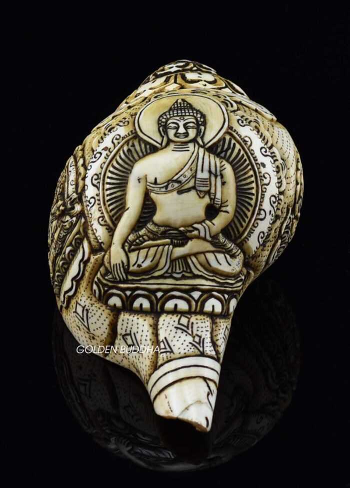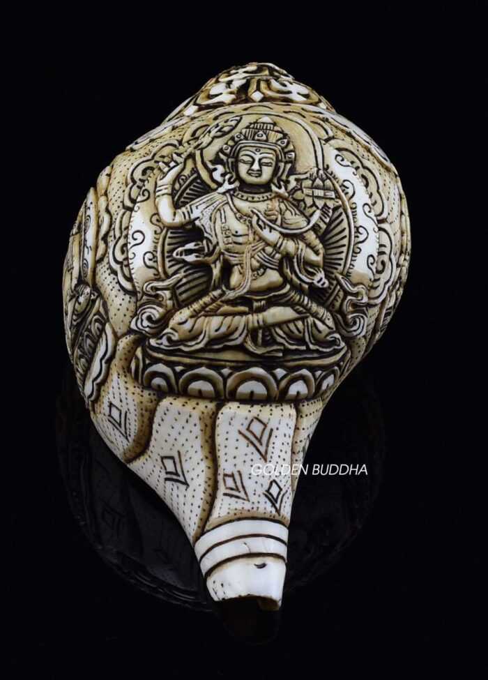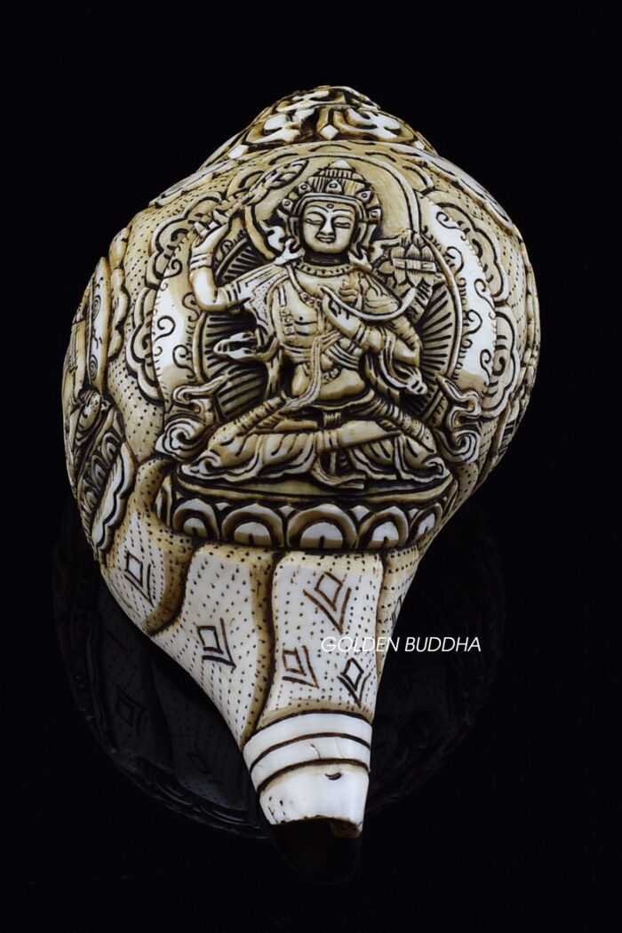 View our hand carved selection of conch shell horns in the product gallery below. Each conch shell horn is hand carved with Buddhist deities to help you gain inspiration. The conch shell horn represents the resonant, melodious and pervasive sound of Dharma teachings.