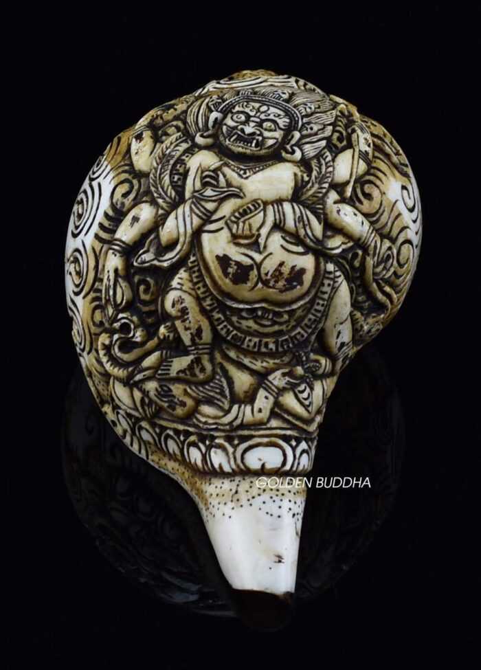 7″ Hand Carved Black Mahakala, Tibetan Ceremonial Conch Shell Horn