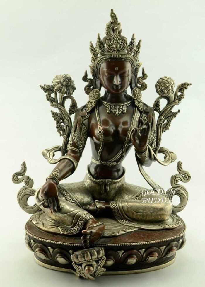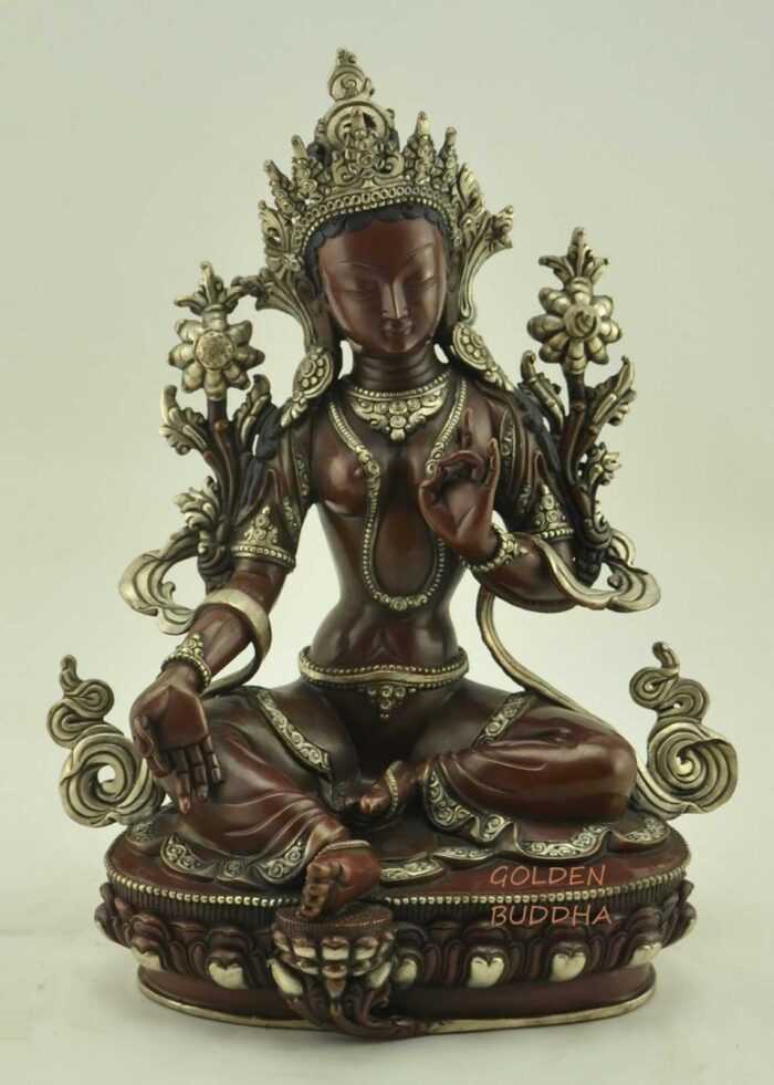 Original price was: $999.00.$699.00Current price is: $699.00.Add to CartBeautiful Green Tara Statue for Sale, 16″ Silver Plated Highlights, Fine Hand Carved Detailing