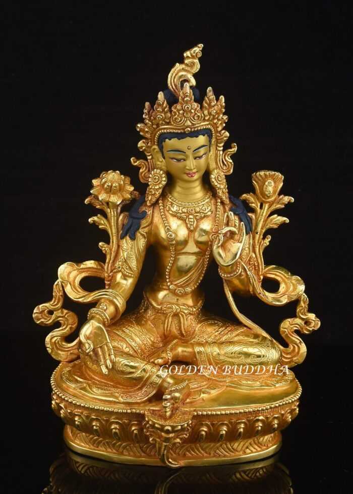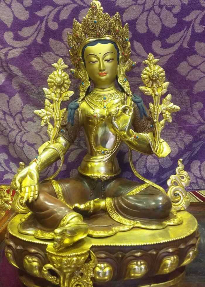 Buy a Green Tara statue for sale that was handmade in Patan, Nepal. The Nepali artisans use the traditional lost wax sculpting method for statue creation. The statue was then fire gilded leaving a pure 24k gold residual finish. Choose yours from our selection below.