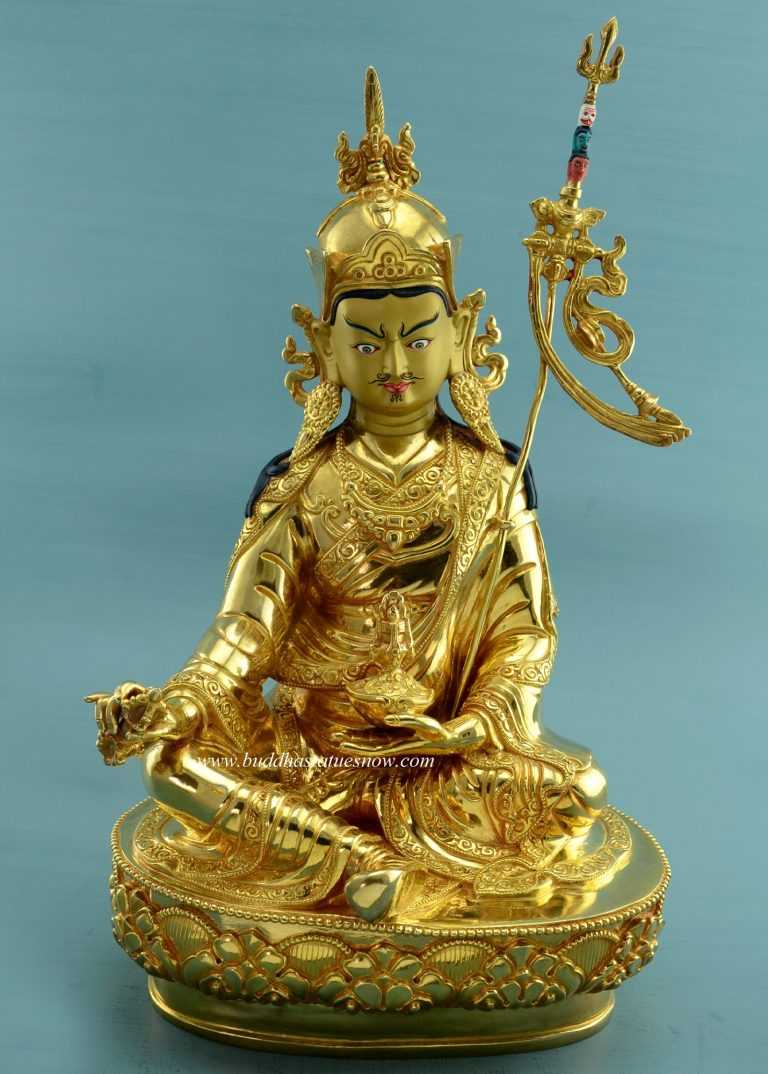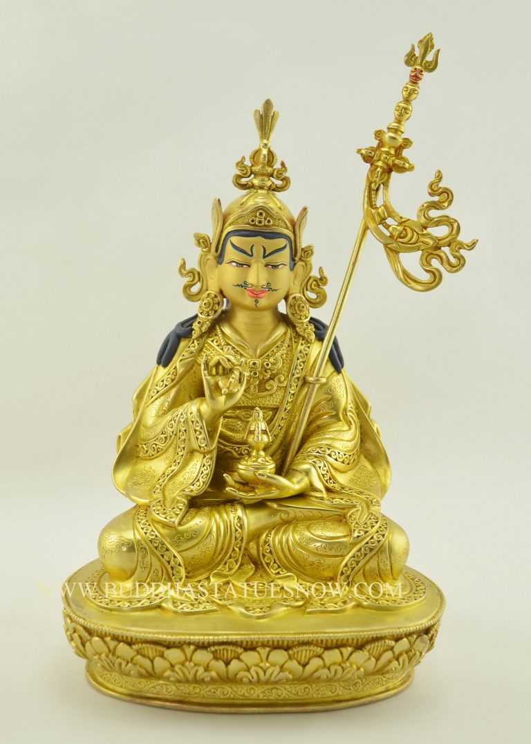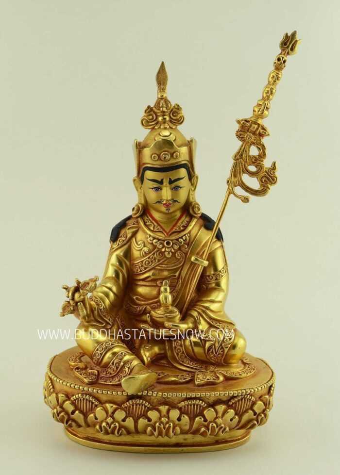 Buy an authentic Guru Padmasambhava statue for sale that was hand crafted in Nepal. Our statues were created using the traditional lost wax sculpting method. As a result, each statue is a handmade original exhibiting fine detail with a traditional finish. Indeed, the Nepali artisans have been the source of the Tibetan monasteries for sculptures and ritual items over many centuries. Guru Padmasambhava is a tantric Buddhist master also known as Guru Rinpoche. Padmasambhava translates as “lotus born” and he was born in the mythical pure land of Oddiyana – land of the lotus. Each Guru Padmasambhava statue for sale depicts the father of Tantric Buddhism in Tibet. Guru Padmasambhava first introduced Tantric Buddhism to Tibet in the 8th century. As a result, Tibetan Buddhists believe he is the second Buddha and founder of Tibetan Buddhism.