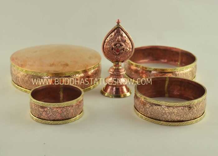 This representational Tibetan mandala set is used in Tibetan rituals to develop generosity and compassion. Symbolically, the mandala represents the entire universe based on the Buddhist cosmos. During the ritual devotees will offer the entire universe and all its wealth before beginning their meditation practice. The lower bases are built up with rice and the rings are then filled with precious items such as coins and jewels. At the apex is a representation of Mt. Meru which is the center of the Buddhist cosmos. Devotees perform the ritual by raising it over their head while reciting their mandala prayers. Symbolically, they are offering the entire universe in exchange for allowing other sentient beings to achieve enlightenment. Indeed, devotees are encouraged to spend the most they can afford for their Tibetan mandala set. This is because self sacrifice accrues the most merit if it is 100% genuine. Each of our Mandala sets are hand carved and embellished with semi-precious stones and metals.