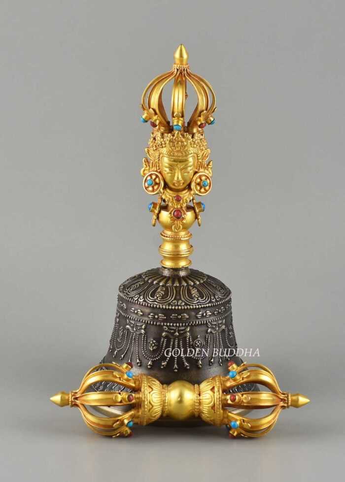 Tibetan Vajra & Bell Set 8″, Gold Plated, Hand Carved in Nepal, Embedded Turquoise and Red Coral