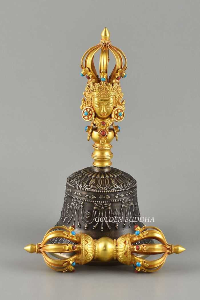 Tibetan Vajra & Bell Set 8″, Gold Plated, Hand Carved in Nepal, Embedded Turquoise and Red Coral