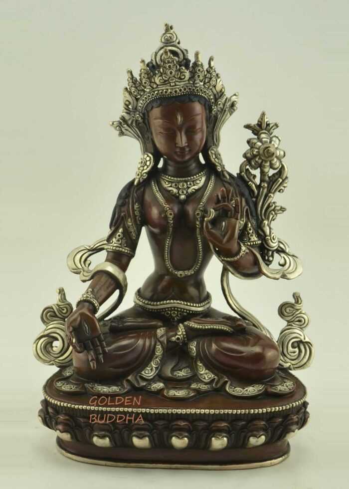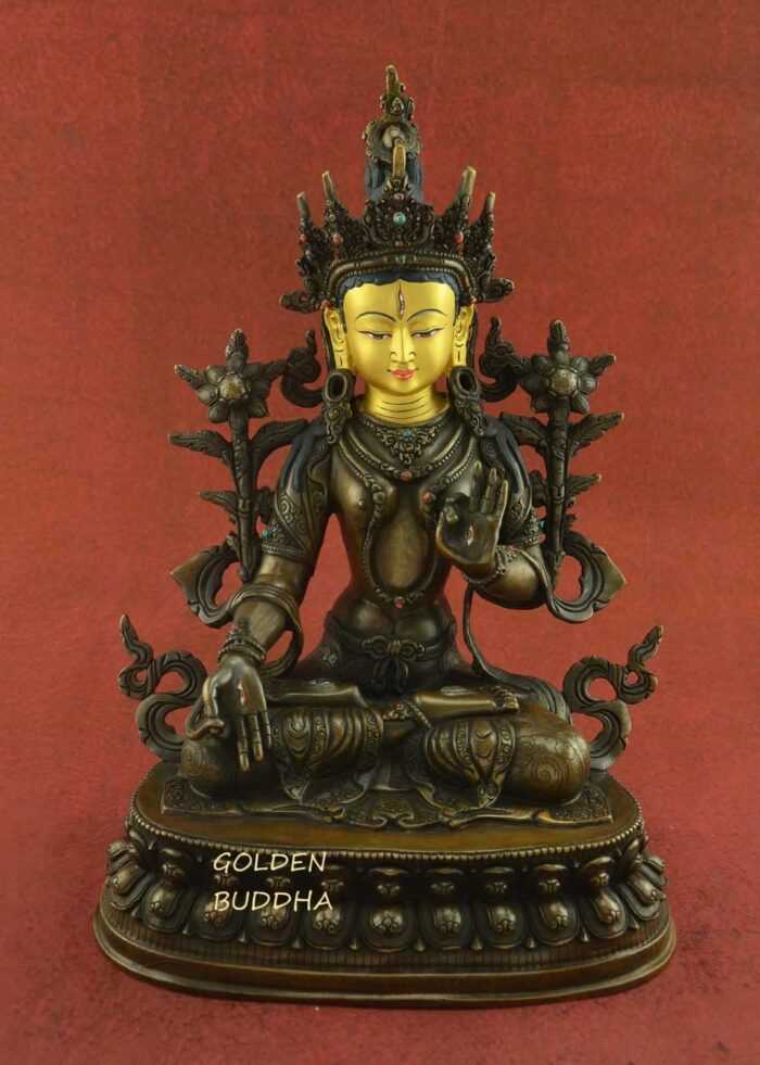 Oxidized Copper 13.25″ White Tara Statue for Sale, Gold Painted Face, Double Lotus