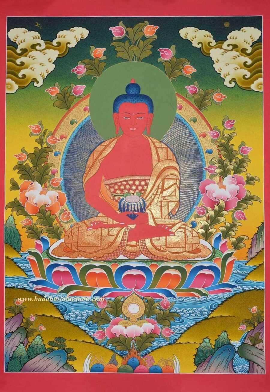 Look at our Amida Buddha Thangka painting to visualize what it will be like in the pure land Sukhavati. In a land of infinite beauty Amida Buddha sits in full lotus pose depicting the Dhyana mudra. Additionally, he sits on a single lotus pedestal with the alms bowl in the palms of his hands. Click here to learn more about Amida Buddha.