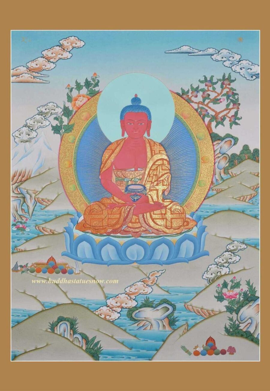 Amitabha Buddha is known as the “Buddha of Infinite Light and Life”. This is because he remained a bodhisattva named Dharmakara for many thousands of lifetimes. As a result, he fulfilled his bodhisattva vows and obtained his own pure land. Additionally, the longevity attribute of Amitabha Buddha is a very powerful element of Tibetan Buddhism. Our Amitabha Buddha Thangka can help practitioners obtain merit and live a long virtuous life. As a result, they will develop good karma and have an auspicious rebirth.