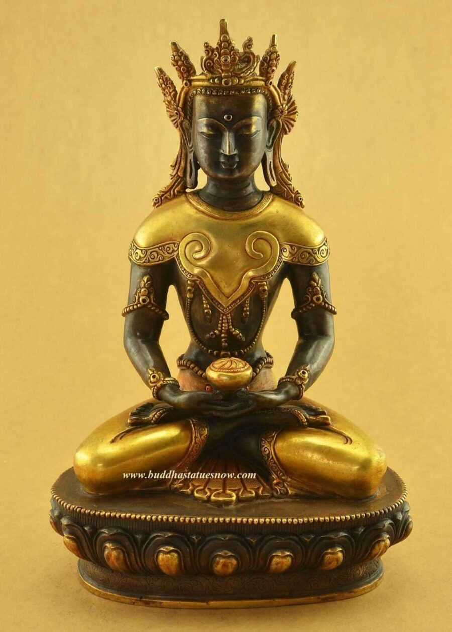 Amitabha Buddha is highly venerated in Mahayana and also Tibetan Buddhism. However, in Tibet he is highly affiliated with his Sambhogakaya embodiment known as Aparmita. Aparmita represents the longevity attribute of Amitabha and they are one in the same. Additionally, Amitabha Buddha is known as the “Buddha of Infinite Light” because of the infinite lifetimes he spent as a bodhisattva known as Dharmakara. Click here to learn more about Amitabha Buddha.