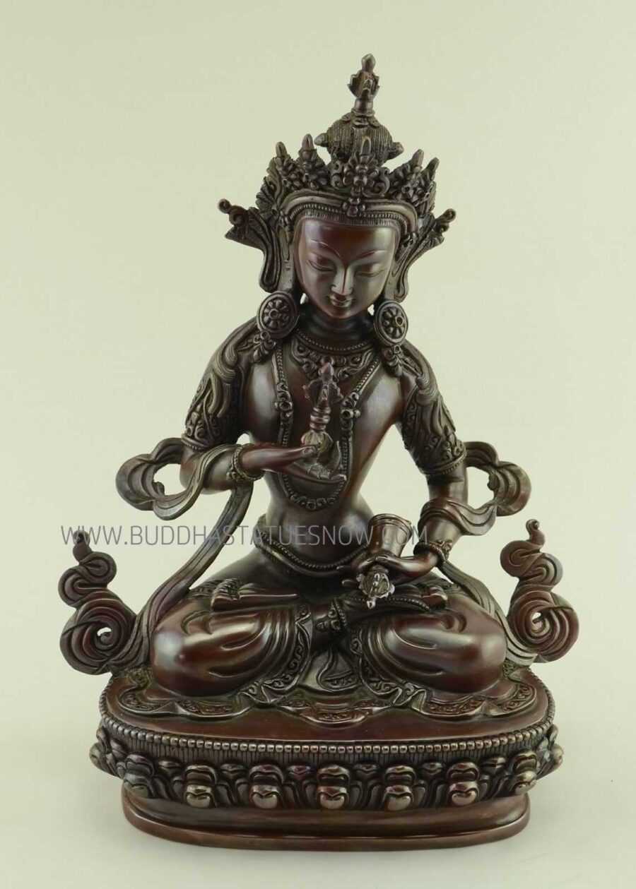 Our antiquated Vajrasattva statue is depicted wearing the crown and jewels of a Bodhisattva. At the request of the buyer we can embed the statue with colorful turquoise stones. Symbolically, turquoise is a special combination of blue and green which gives the statue a dual meaning. Indeed, blue signifies the purity of the Buddhas and green symbolizes their readiness to act. These special adornments embellish your statue well and will inspire all those who lay their eyes on it.