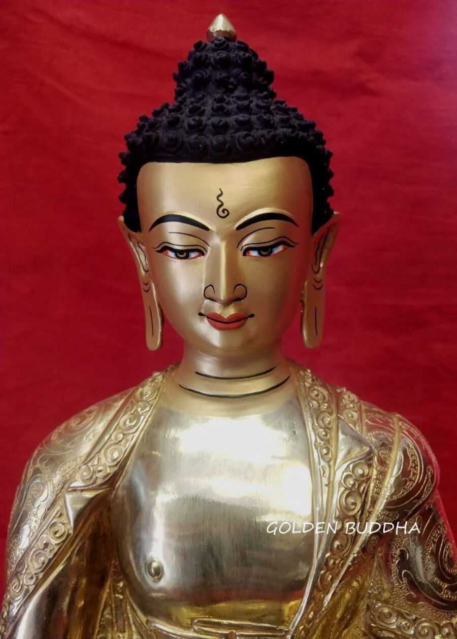 Other traditional elements of this golden Shakyamuni Buddha statue include the ushnisha topknot, the elongated ears, third eye of wisdom and right turning hair coils. The statue also features elaborate face painting and intricate carvings on his robe. Click here to learn more about the original Buddha of our time.