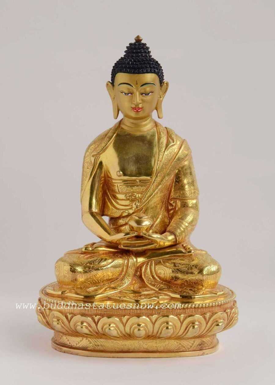 Our Amida Buddha statue is a true reflection of the Buddha of “Infinite Light and Life”. His monastic robe is engraved with elegant designs. Additionally, our Amida Buddha statue features a 24K gold gilded finish applied using the fire gilding method. Also, the statue was handmade in Nepal using the traditional lost wax sculpting method. As a result, the buyer can rest assured of receiving a monastic quality statue.