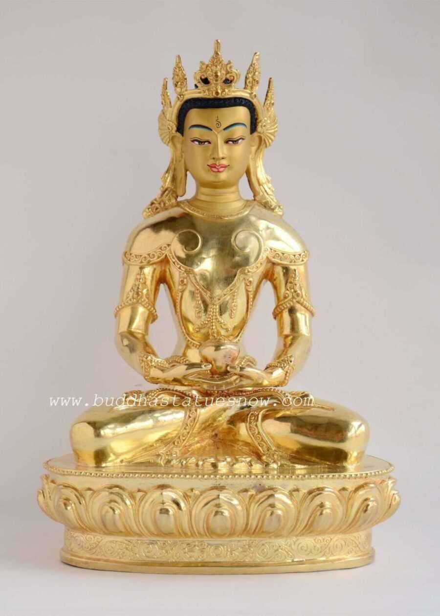 While in the earthly realm as Dharmakara, Amitabha was a prince who renounced his kingdom to pursue a life of austerity. Dharmakara accumulated infinite merit and eventually achieved Buddhahood. As a result, he now has his own pure land – Sukhavati. In the “Larger Sutra of Immeasurable Life” it is proclaimed that devotees only need to recite his name 10 times to gain entry into Sukhavati. Our crowned Amitabha statue will last for many lifetimes and can be passed down for many generations.