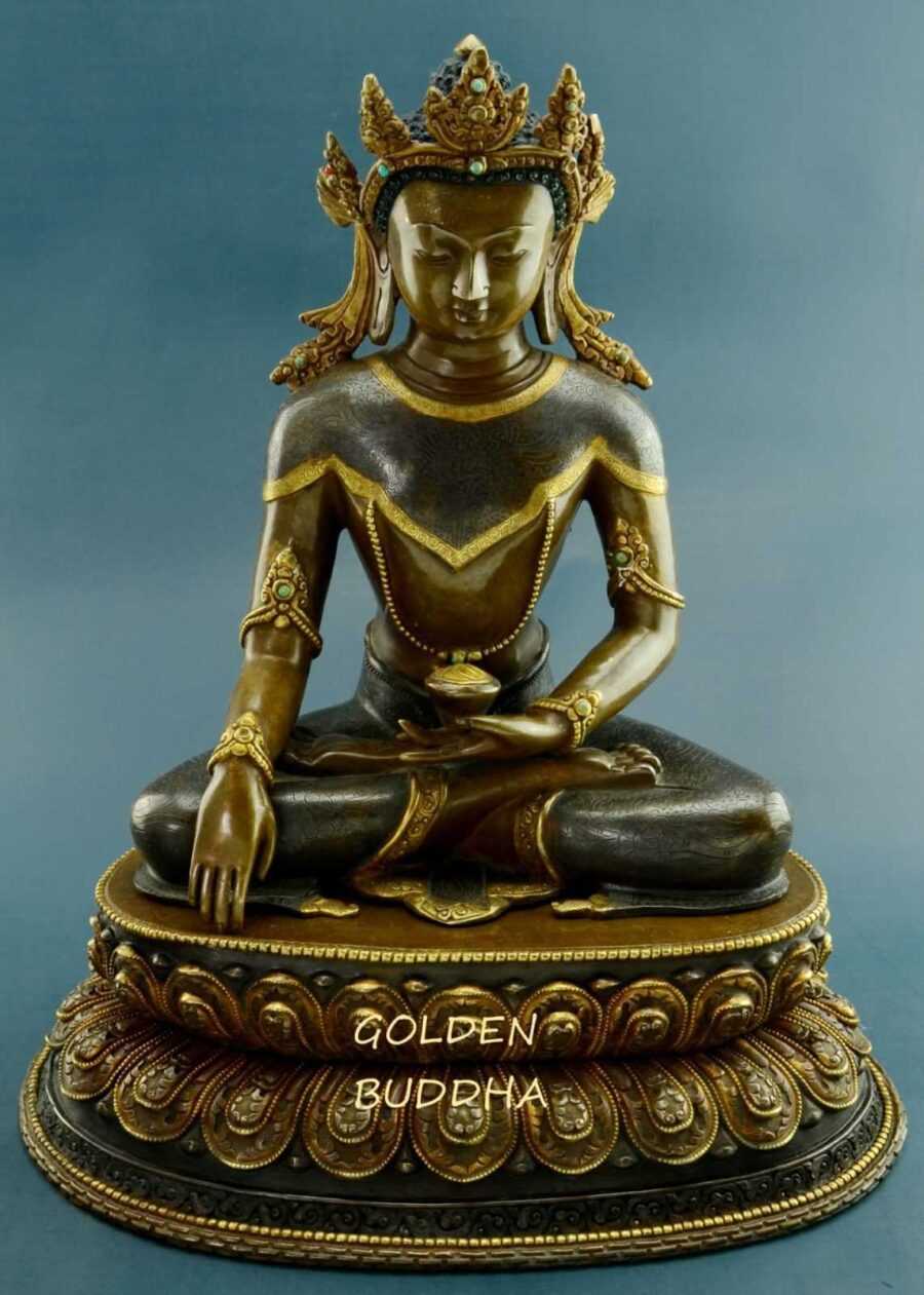 Our crowned Shakyamuni Buddha statue is depicted wearing the crown and jewels of a bodhisattva. As a result, the gold gilded adornments set off the austerity of the oxidized copper. As an added bonus the crown and jewelry are adorned with special turquoise colored stones. The color turquoise is a special combination of blue and green. Indeed, blue signifies the purity of the Buddhas and green symbolizes their readiness to act. This crowned Shakyamuni Buddha statue wears the adornments very well and they will inspire all those who lay their eyes on your new statue.