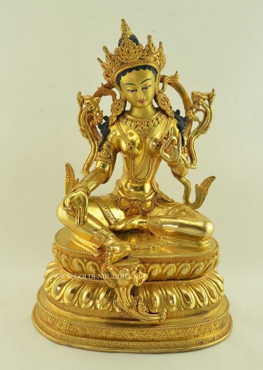 At the request of the buyer, we would be happy to adorn the crown and jewels of this Green Tara Bodhisattva statue with turquoise and red stones. At no extra charge, the skilled artisan can embellish the statue with special decoration before delivery.