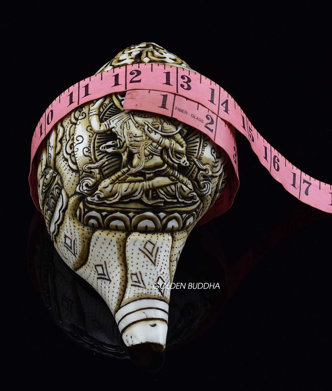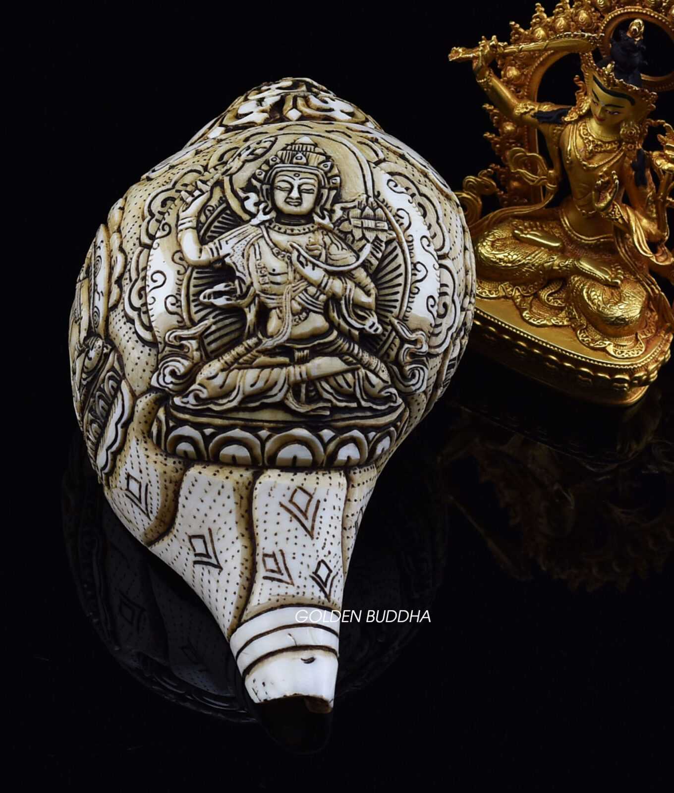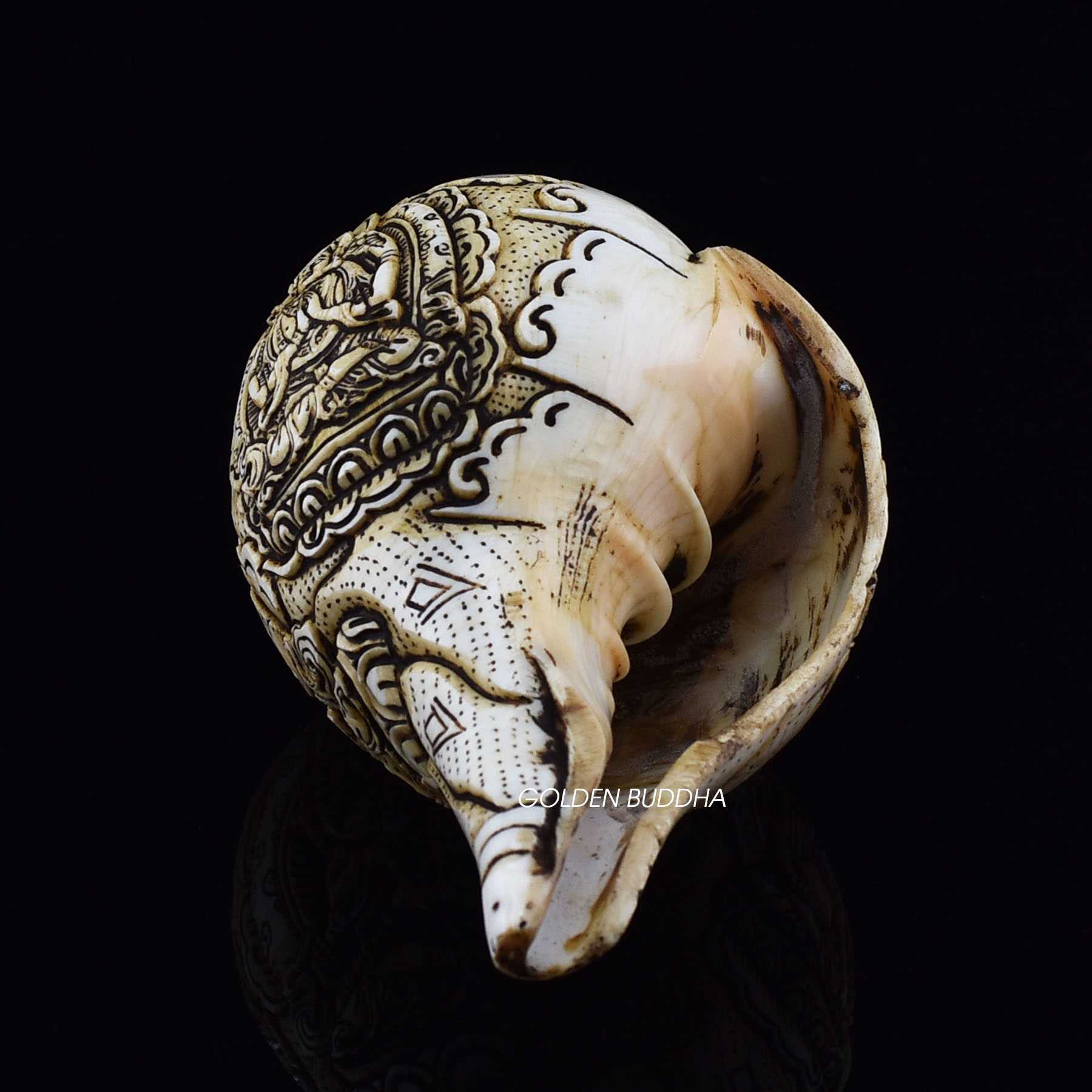 Manjushri Tibetan Ceremonial hand carved conch shell horn crafted in Patan, Nepal by traditional artisans. The sound of our authentic Tibetan Ceremonial conch shell horn represents the melodious, resonant and pervasive sound of the Dharma teachings. Gain inspiration from the deities elegantly carved on the exterior of the shell to obtain spiritual liberation from the murkiness of Samsara. All items come with free shipping, however the conch shell is an authentic marine item. Please note that some countries may restrict the entry of such products. Be sure to consult with the local customs office before completing your purchase. You can view our shipping policy here.