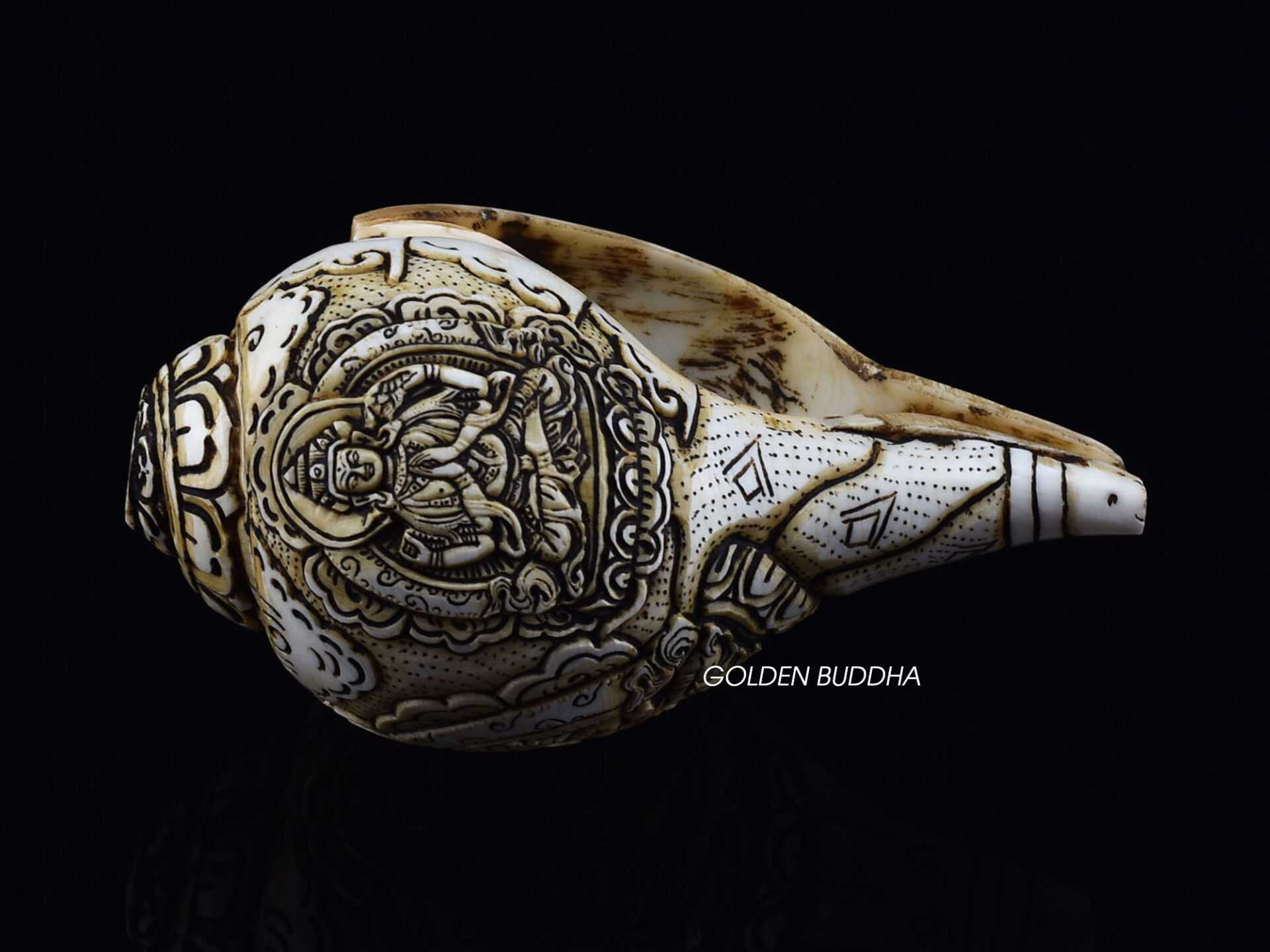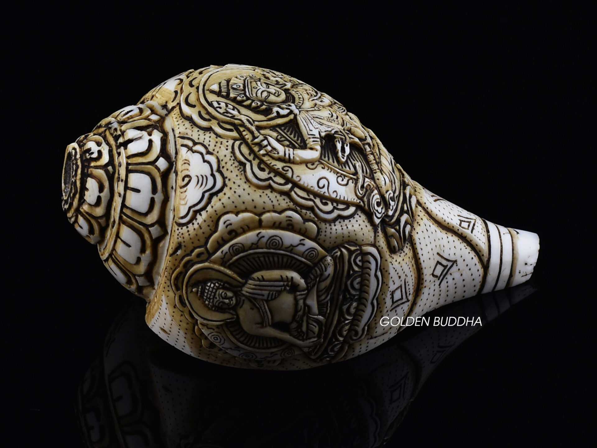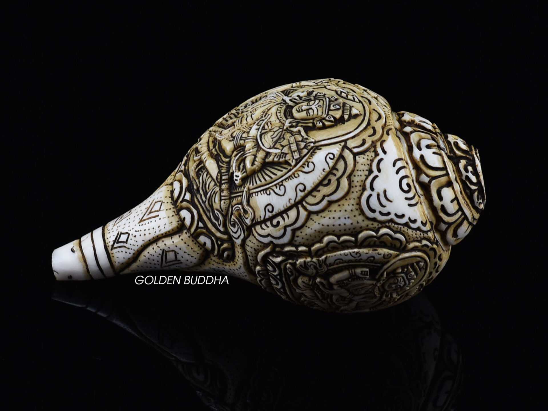 Manjushri Tibetan Ceremonial hand carved conch shell horn crafted in Patan, Nepal by traditional artisans. The sound of our authentic Tibetan Ceremonial conch shell horn represents the melodious, resonant and pervasive sound of the Dharma teachings. Gain inspiration from the deities elegantly carved on the exterior of the shell to obtain spiritual liberation from the murkiness of Samsara. All items come with free shipping, however the conch shell is an authentic marine item. Please note that some countries may restrict the entry of such products. Be sure to consult with the local customs office before completing your purchase. You can view our shipping policy here.