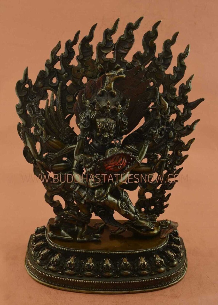 In Tibetan Buddhism, the deity Hayagriva is the wrathful embodiment of Avalokiteshvara, the “Bodhisattva of Compassion”. Our Hayagriva statue is depicted with his consort Krodhishvari locked in sensual embrace. Symbolically, their embrace represents the eternal union of compassion and wisdom. As a result, they have transcended life and death to enter the state of enlightenment. Additionally, Hayagriva is known as the “horse necked one” which is symbolized by the horse’s head surmounting his own head.