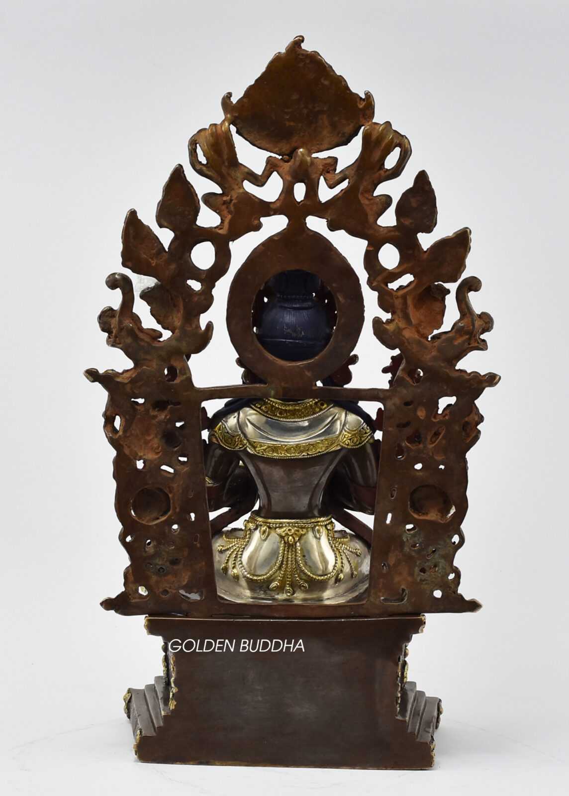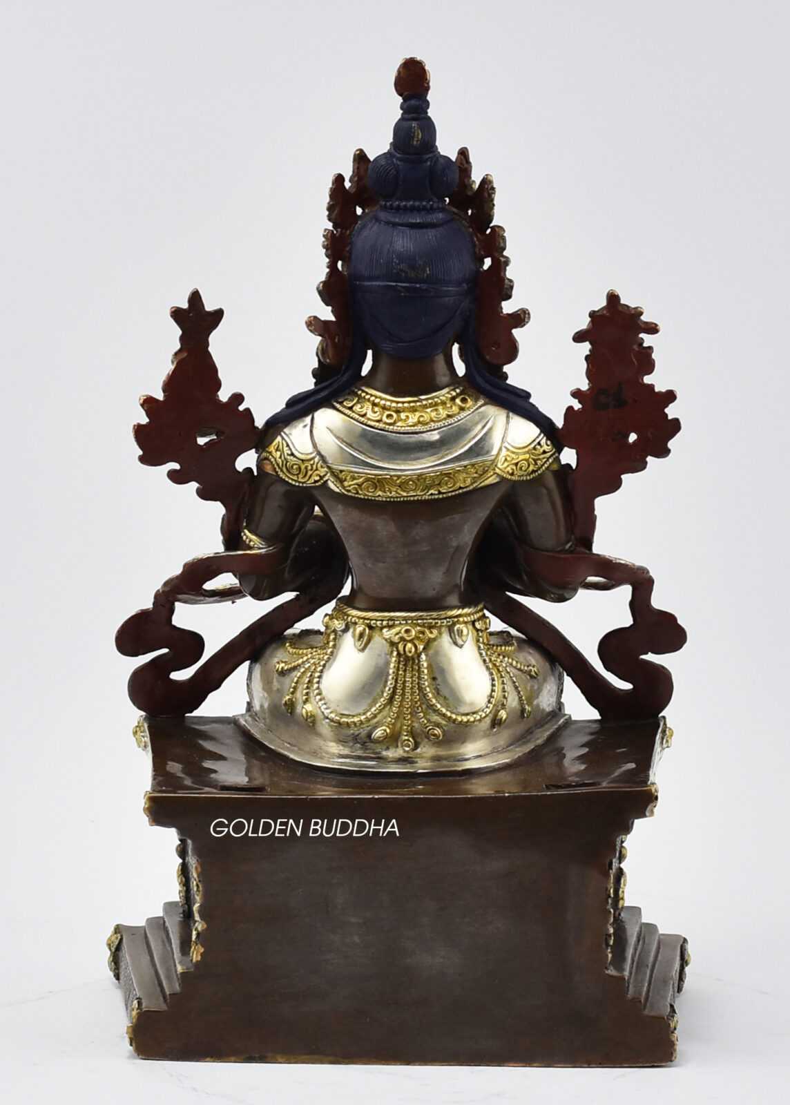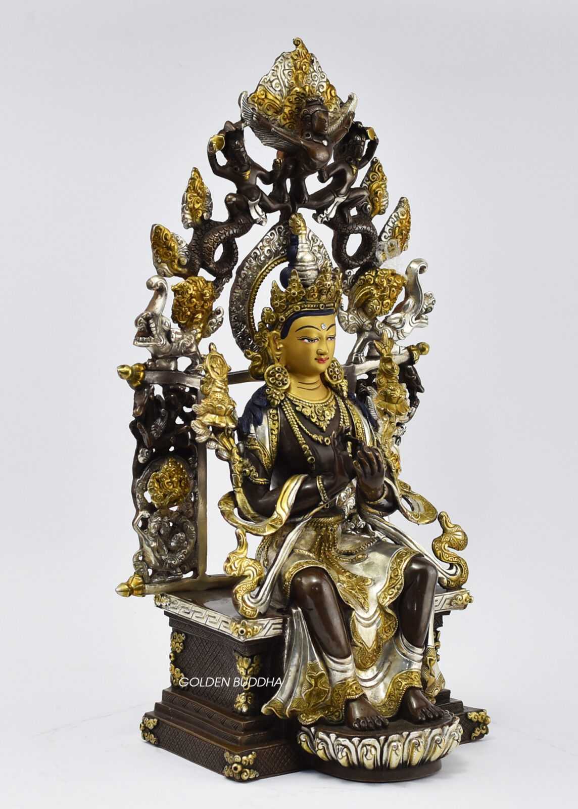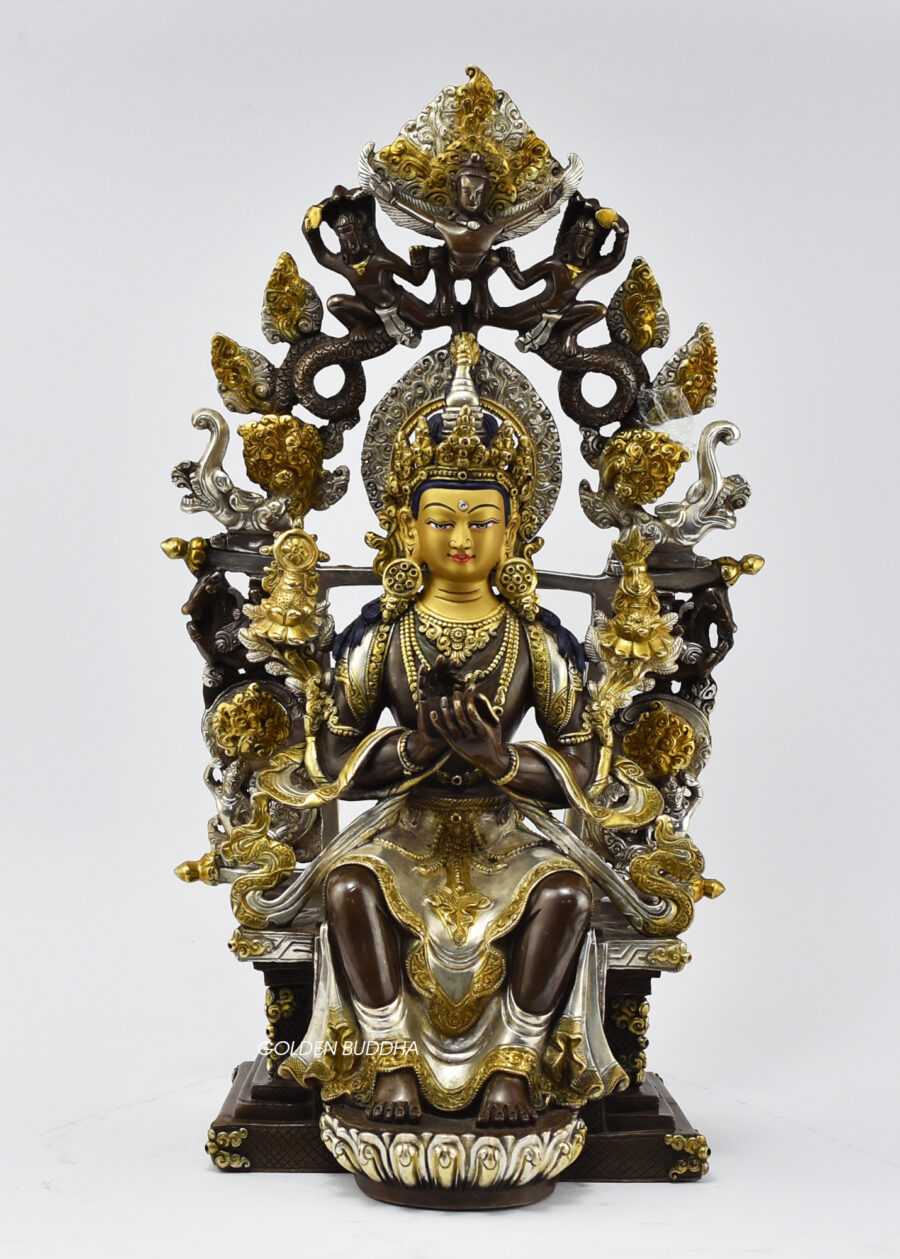 Our Maitreya Buddha statue features a silver, gold plated and copper finish. Additionally, the statue was hand carved using the traditional lost wax sculpting method. Traditional sculpture exhibits the finest detail in the statue. We also can insert turquoise and red coral stones into the statue upon request from the buyer. We are happy to perform this service free of charge before shipping.