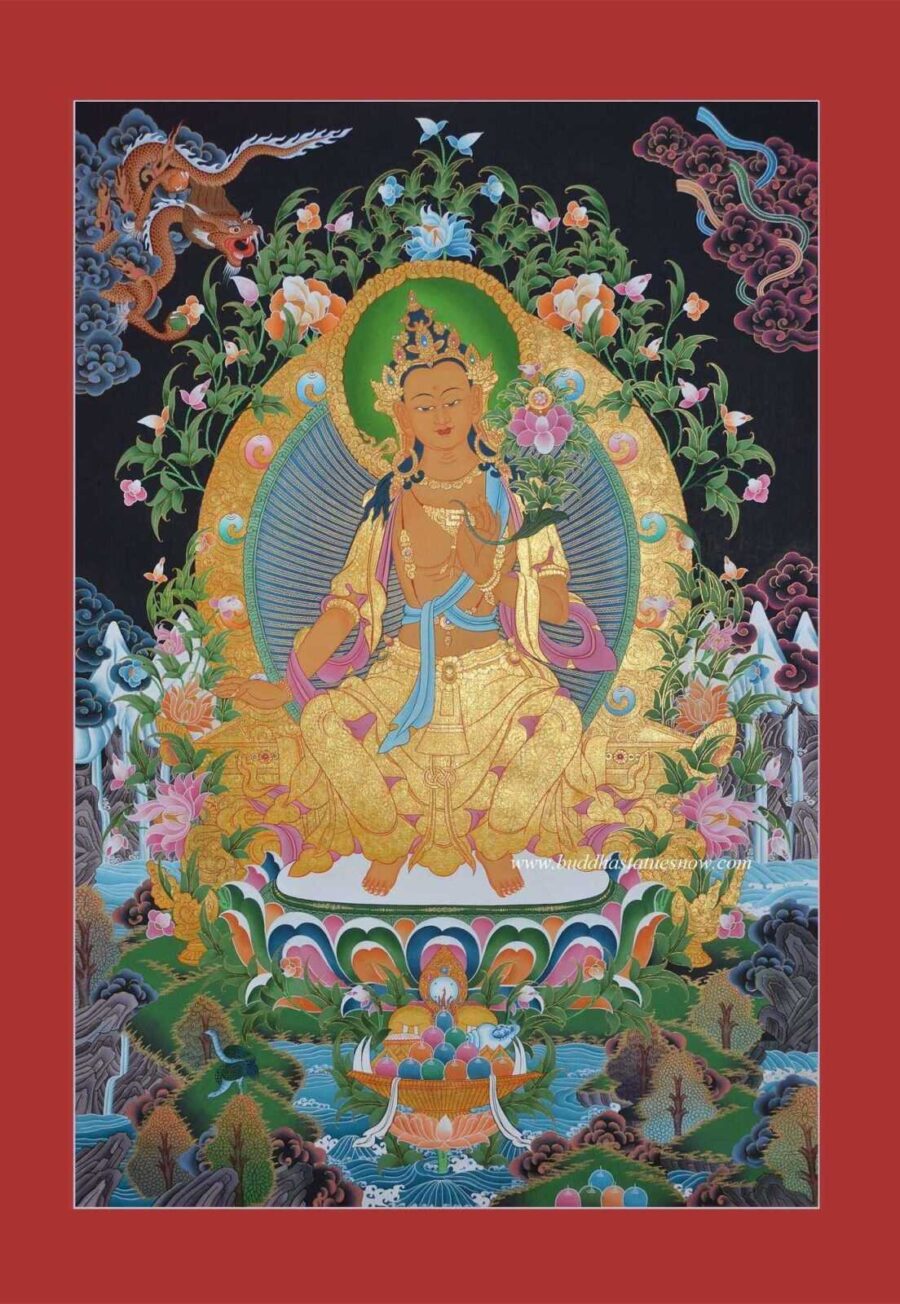 According to the Maitreya prophecy, Maitreya will come in the future to resurrect Buddhism. This is because sentient life will have fallen into disarray after the Dharma teachings were long forgotten. Our Future Buddha Tibetan thangka portrays Maitreya sitting upright and prepared to fulfill the prophecy. Currently, Maitreya Buddha waits in Tusita Heaven. When his time comes, he will return to the earthly realm to obtain Buddhahood and reteach the Dharma.