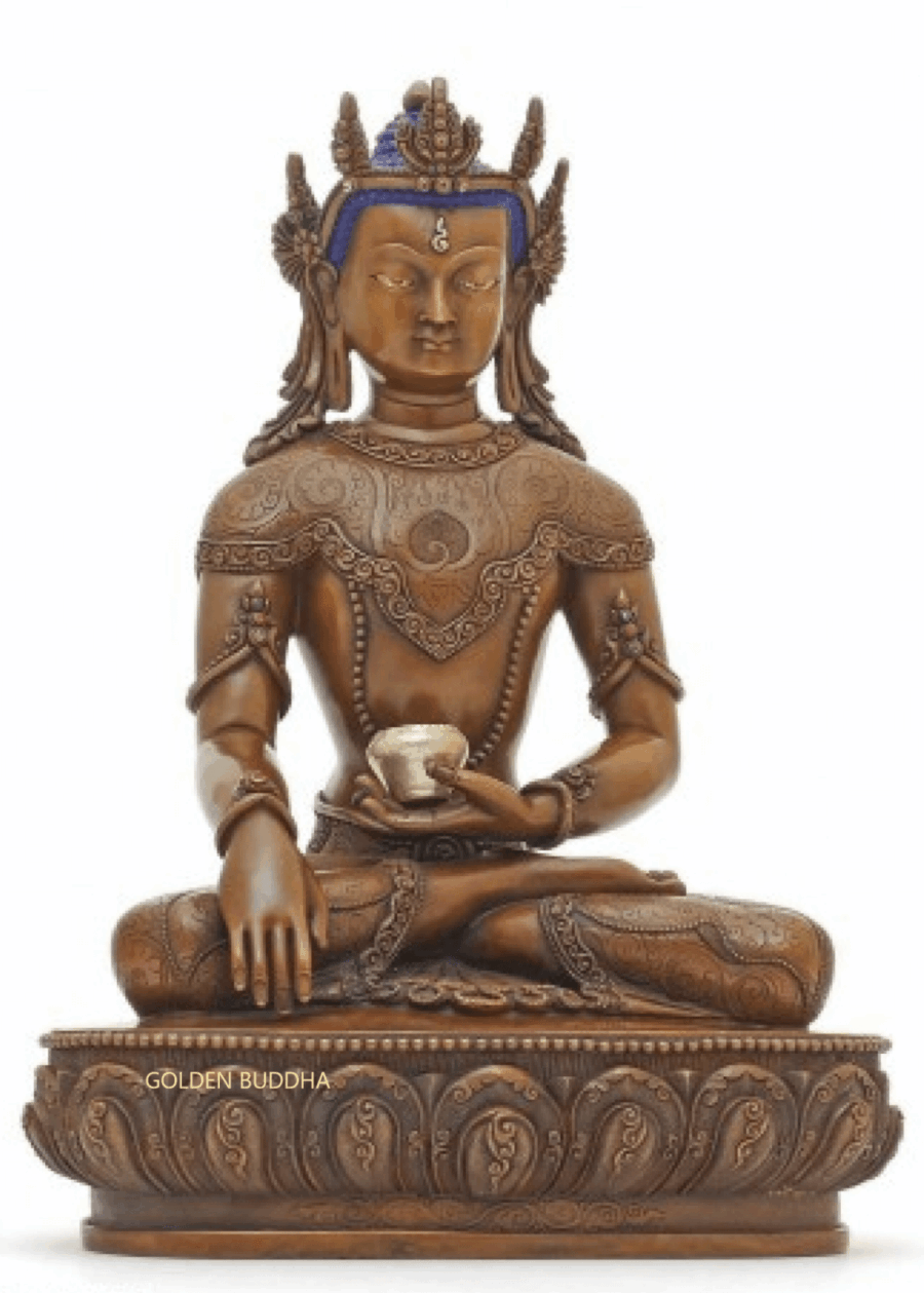 Our masterpiece Akshobhya statue was created using the lost wax sculpting method in Patan, Nepal. Therefore, it is one of a kind. Indeed, the buyer will have an original statue for many generations. Additionally, the intricate details of the statue are second to none. This is clearly evident in the elaborate engravings in his robe and the double lotus pedestal. Please look closely to observe the eight Tibetan auspicious symbols carved into Akshobhya’s robe. The artisan took over one year to complete this masterpiece Akshobhya.