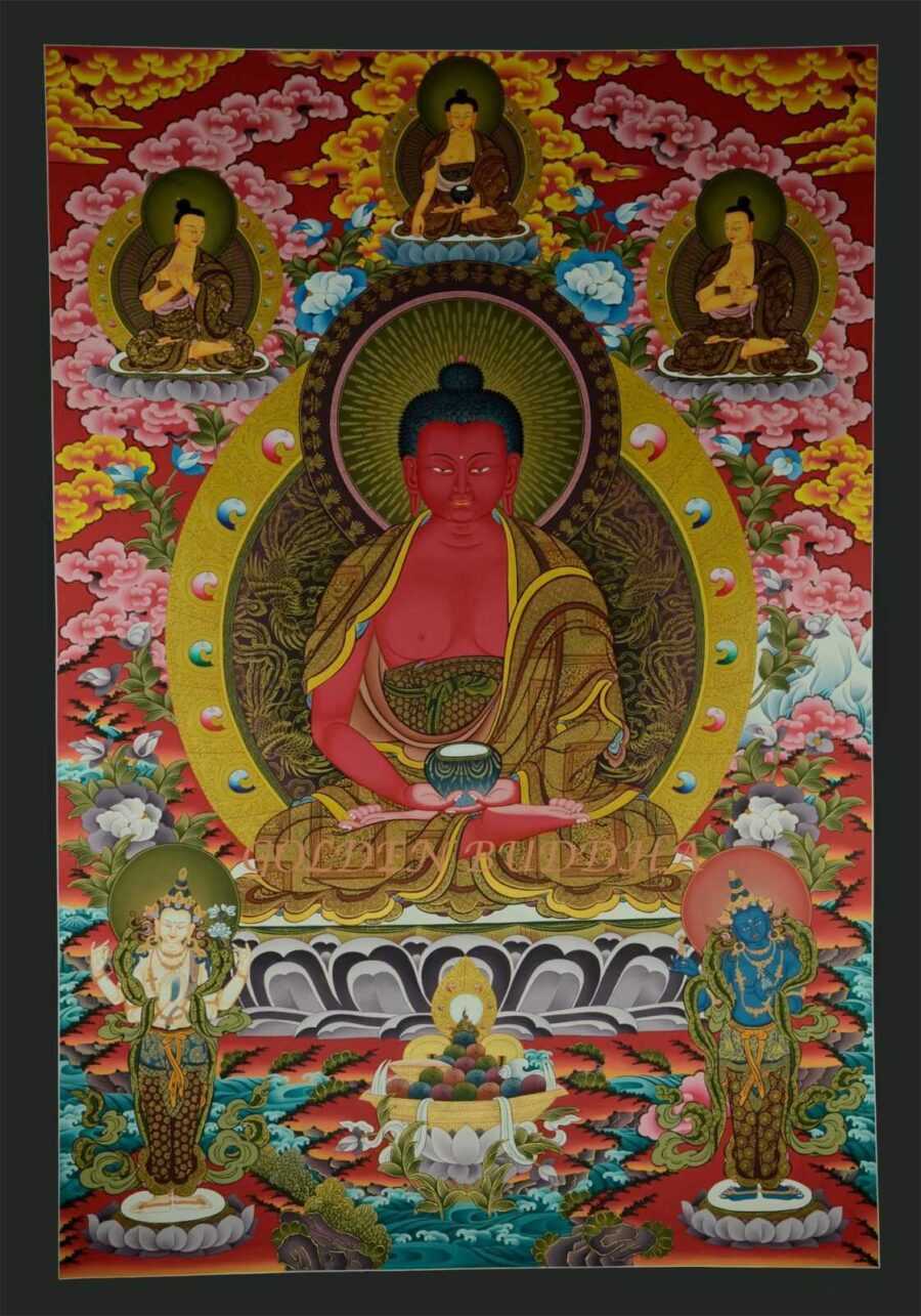 Our Masterpiece Amitabha Tibetan Thangka portrays Amitabha Buddha. While Formerly known as a Bodhisattva named Dharmakara, he accumulated an infinite amount of merit. After he obtained Buddhahood, he became known as the “Buddha of Infinite Light”. Amitabha had vowed to obtain his own pure land before becoming a Buddha and he spent many thousands of lifetimes achieving this goal.