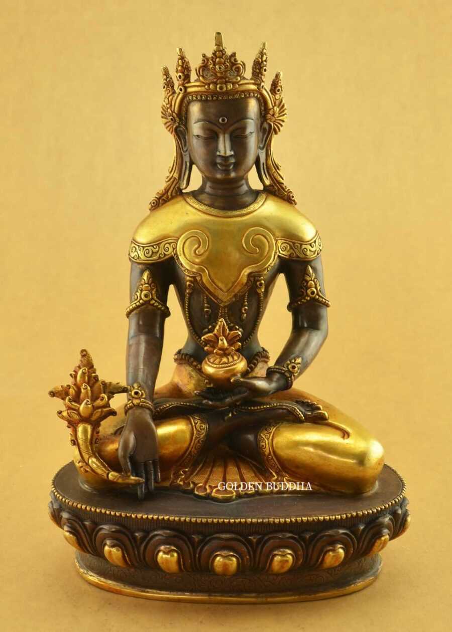 This Healing Buddha statue depicts him sitting in full lotus pose on a single lotus pedestal. His right hand holds a sprig from the myrobalan plant between the thumb and index finger. The fingers are pointing towards the ground, plus the palm of his hand is flat and facing away from the body. As a result, his right hand is depicting the Varada “boon granting” mudra. Indeed, the Medicine Buddha is giving the gift of medicine to all sentient life.