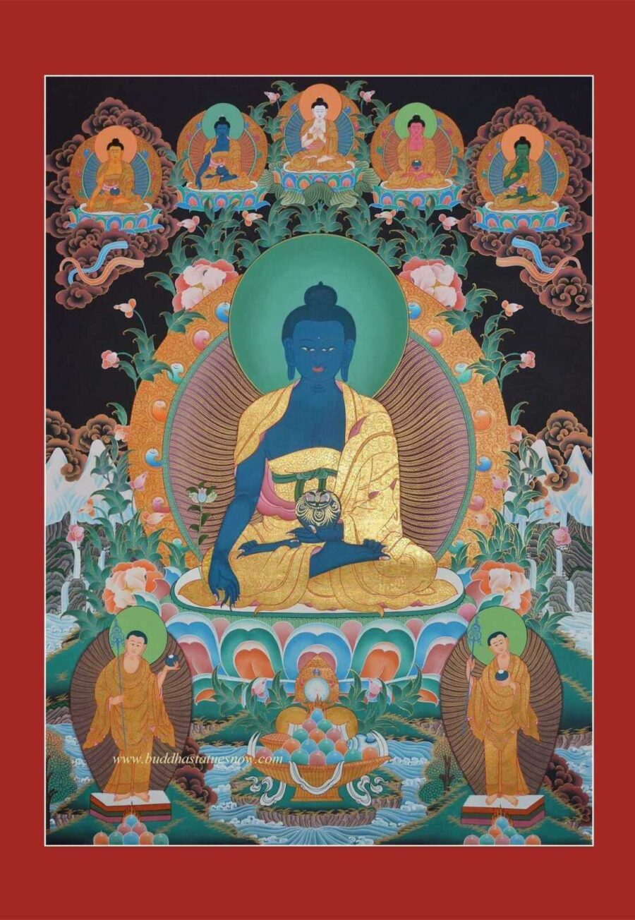 This Healing Buddha thangka features his eastern pure land called “Pure Lapis Lazuli”. His sutra describes the ground being made of pure lapis lazuli and the buildings constructed from the seven treasures. Additionally, his land radiates with the dark blue light of lapis lazuli. This blue light contains powerful healing attributes that will “awaken the minds of beings dwelling in darkness”.