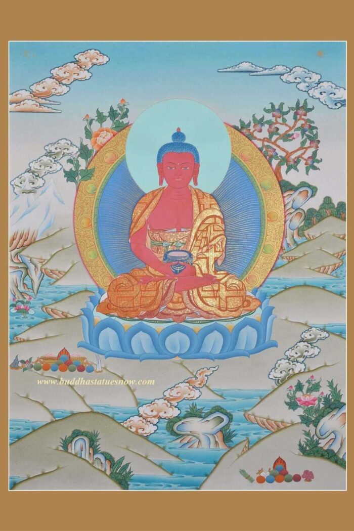 This Medicine Buddha thangka painting depicts him sitting in full lotus pose on a single lotus pedestal. Additionally, he is holding the medicinal myrobalan plant held between his index finger and thumb in the right hand. Furthermore, his right hand is displaying the classic Varada “gift giving” mudra. Indeed, Buddhists believe that Medicine Buddha gave the gift of medicine to sentient life. Additionally, Buddhists believe that unwholesome karma is the source of all suffering and diligent practice is the cure.