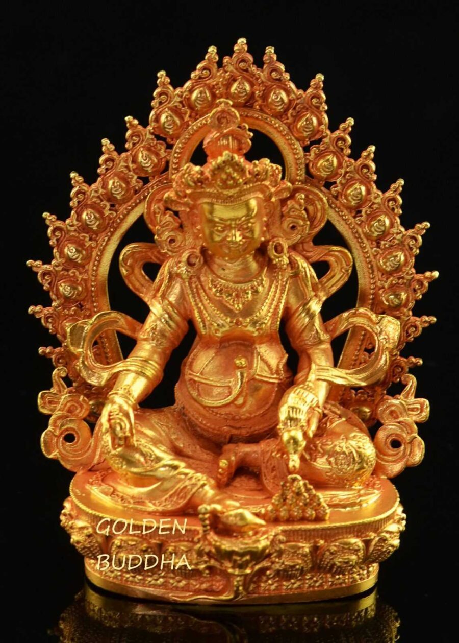 Our miniature Yellow Jambhala statue includes all the traditional elements of Yellow Jambhala. Nehulay, his pet mongoose, is perched on his left forearm spitting forth precious jewels. Additionally, Yellow Jambhala sits in panhandle position because he is always ready to come to the assistance of devotees. As an emanation of Ratnasambhava, Jambhala seeks to alleviate poverty and spread wealth and happiness. As a result, our miniature Yellow Jambhala statue will bring luck and prosperity to the owner. This statue is an excellent gift for friends and associates, bulk purchase is available.