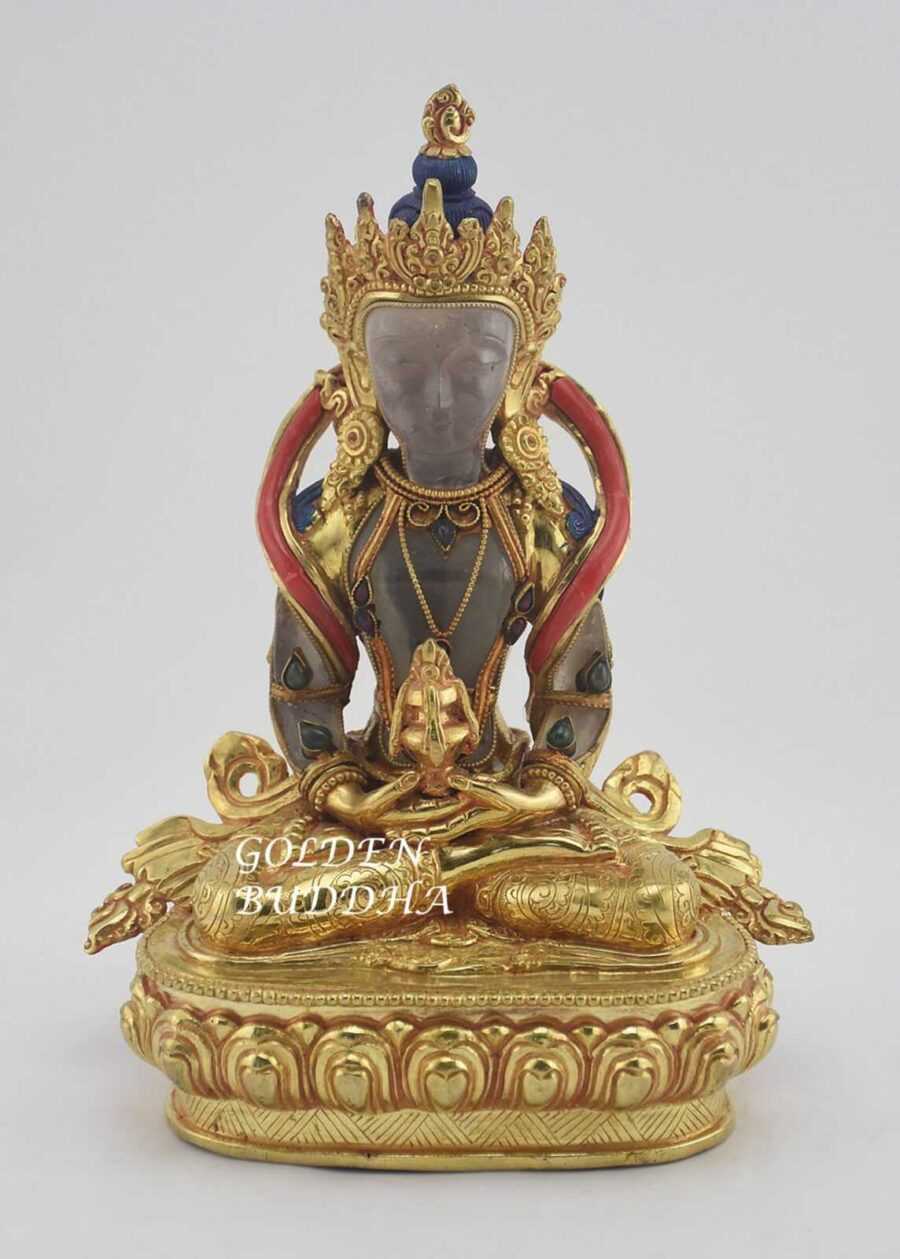 This Tibetan Aparmita statue was hand carved using the traditional lost wax sculpting method. Additionally, the sculptor completed the statue with a fire gilded 24K pure gold finish. The statue also features a crystal body and embedded semi-precious stones. At the request of the buyer, we can embellish the statue’s Bodhisattva crown and earrings with turquoise and red coral stones. Please be sure to place the request before shipping and we can include the service at no extra charge.