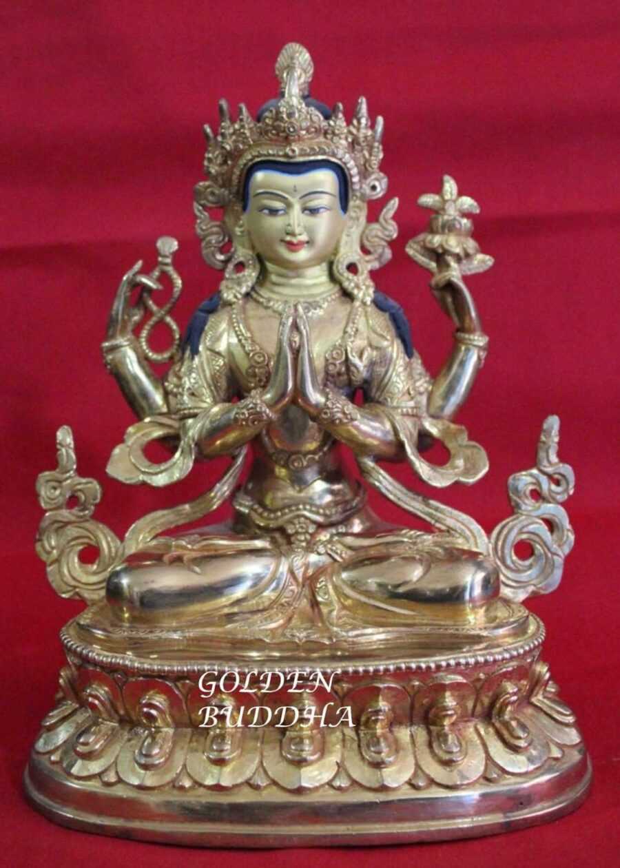 In the the upper right hand our Nepali Lokeshvara statue clutches the 108 mala beads because he is constantly reciting his mantra “Om Mani Padme Hum“. Additionally, the beautiful lotus flower grows over his left shoulder. Lokeshvara is also known as “Padmapani” which is a Sanskrit word meaning “lotus holder”. Indeed, the lotus flower is very important in Buddhism because it is a symbol for supreme awakening.