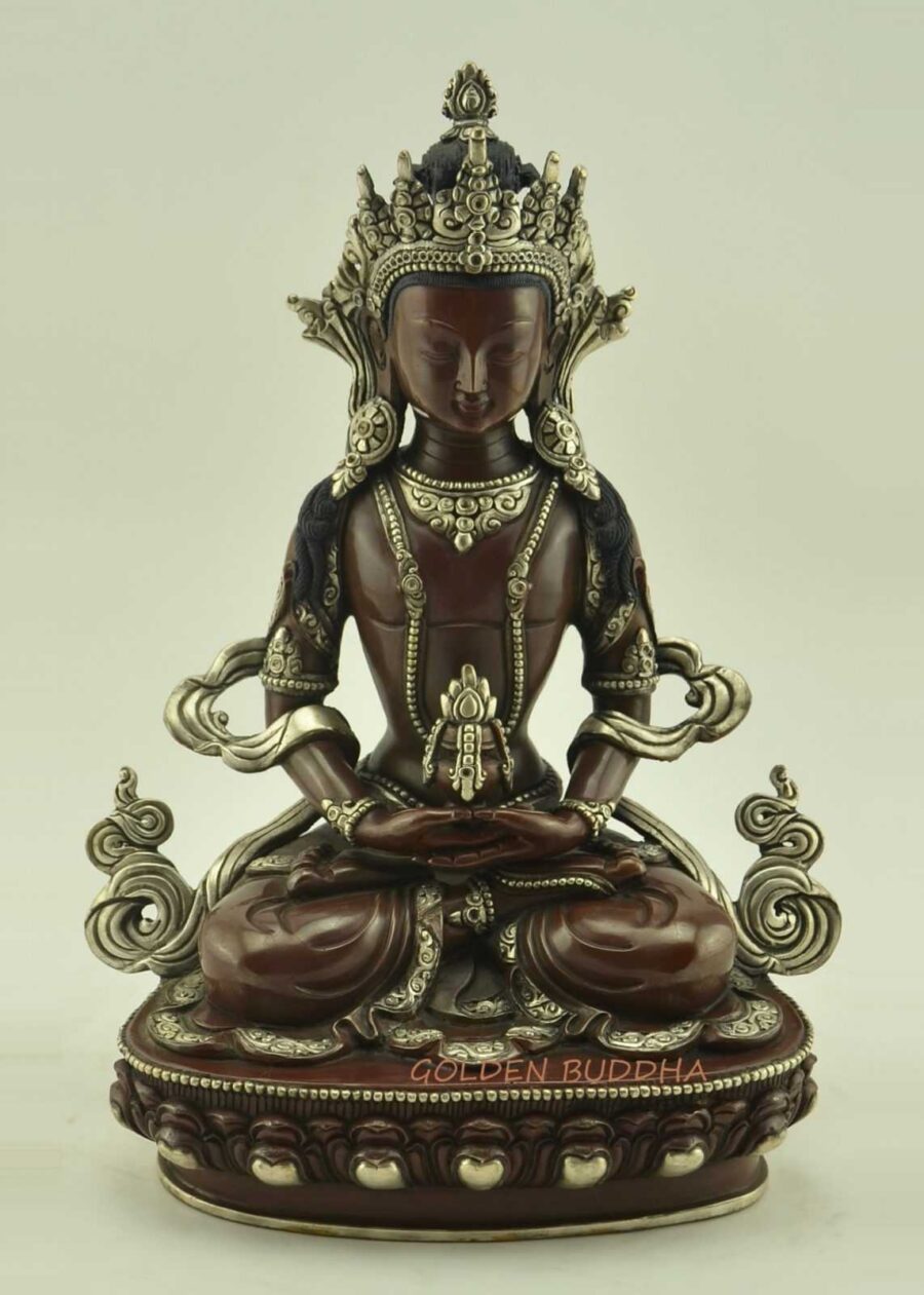 Furthermore, this sculpture was handmade using the traditional lost wax sculpting method. The details of the statue are completed with intricate precision and harmony. Additionally, the sculptor used silver plating to highlight the features of the statue. As a result, the new owner can rest assured that they have procured a monastic quality antiquated Aparmita statue. Indeed, the Nepali artisans have been the preferred source of the Tibetan monasteries for many centuries.