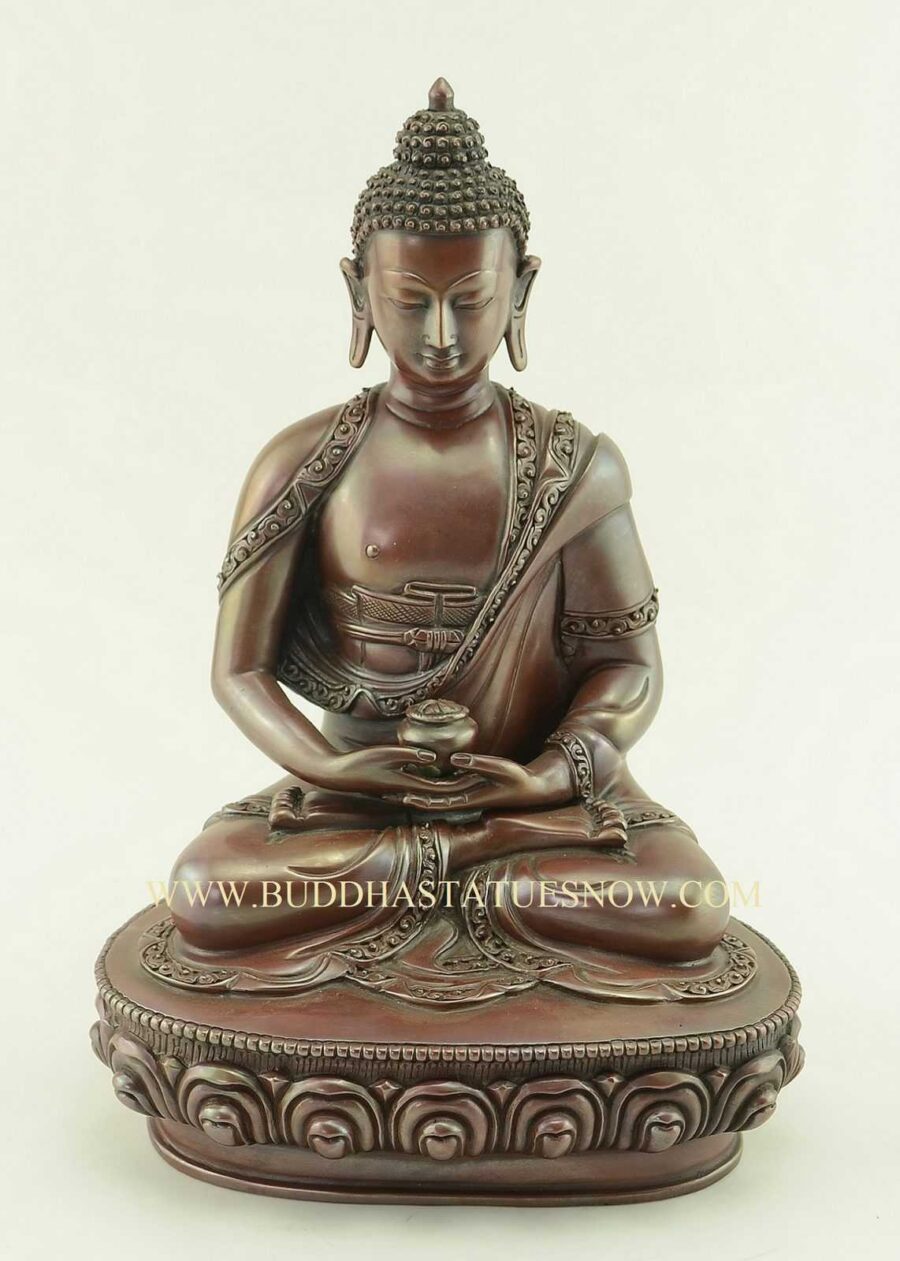 This antiquated Amitabha statue sits in full lotus pose on a single lotus pedestal. His hands are flat in his lap depicting the Dhyana “meditation” mudra. Additionally, the traditional alms bowl of a Buddhist monk sits in the palm of his right hand. The alms bowl of a Buddhist monk has a very special symbolic meaning. This is because the bowl symbolizes ultimate renunciation and it also holds the three nectars which eliminate the three poisons.