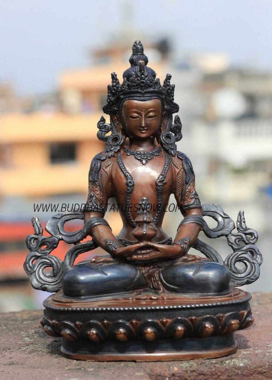 Furthermore, this Amitayus statue has been given an antiquated finish using an oxidized copper alloy. The deity sits in full lotus pose on a single lotus pedestal. The Nepali sculptor dressed the statue in the crown and jewels of a bodhisattva. We are happy to adorn the crown and jewels with turquoise and coral stones at no extra charge – upon the request of the buyer. Amitayus will wear the adornments well and enhance the statue features.