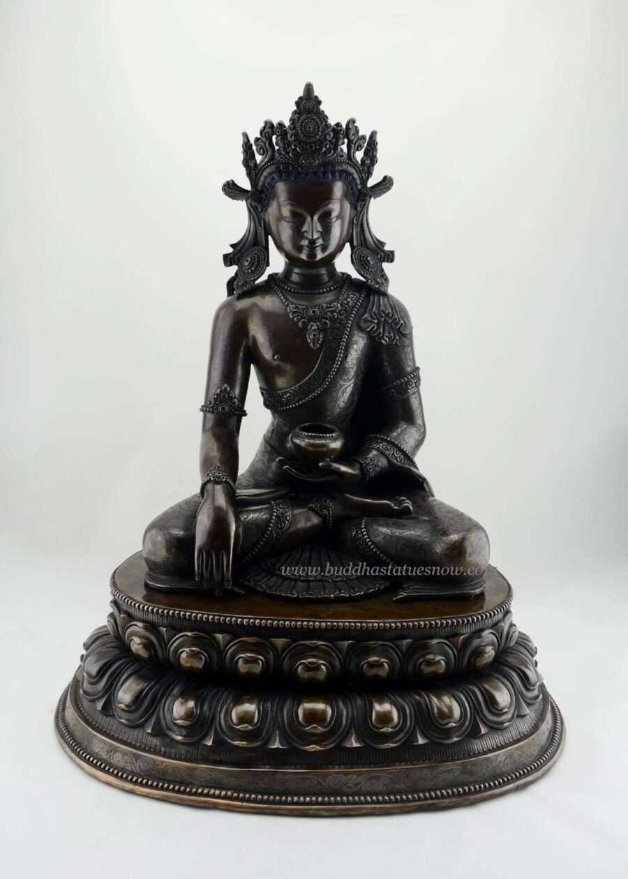Our crowned Shakyamuni statue is a portrayal of the original Buddha. The sculpture displays intricate details throughout. By closely examining the robe it is possible to appreciate the exquisite craftsmanship and skill that are required. Additionally, our statue sits on a double lotus pedestal using the Bhumisparsha and Dhyana mudra. Our Shakyamuni statue also features him in the crown and jewels of a bodhisattva. Upon request, we will be happy to adorn the crown and jewels with turquoise and coral stones at no extra charge.