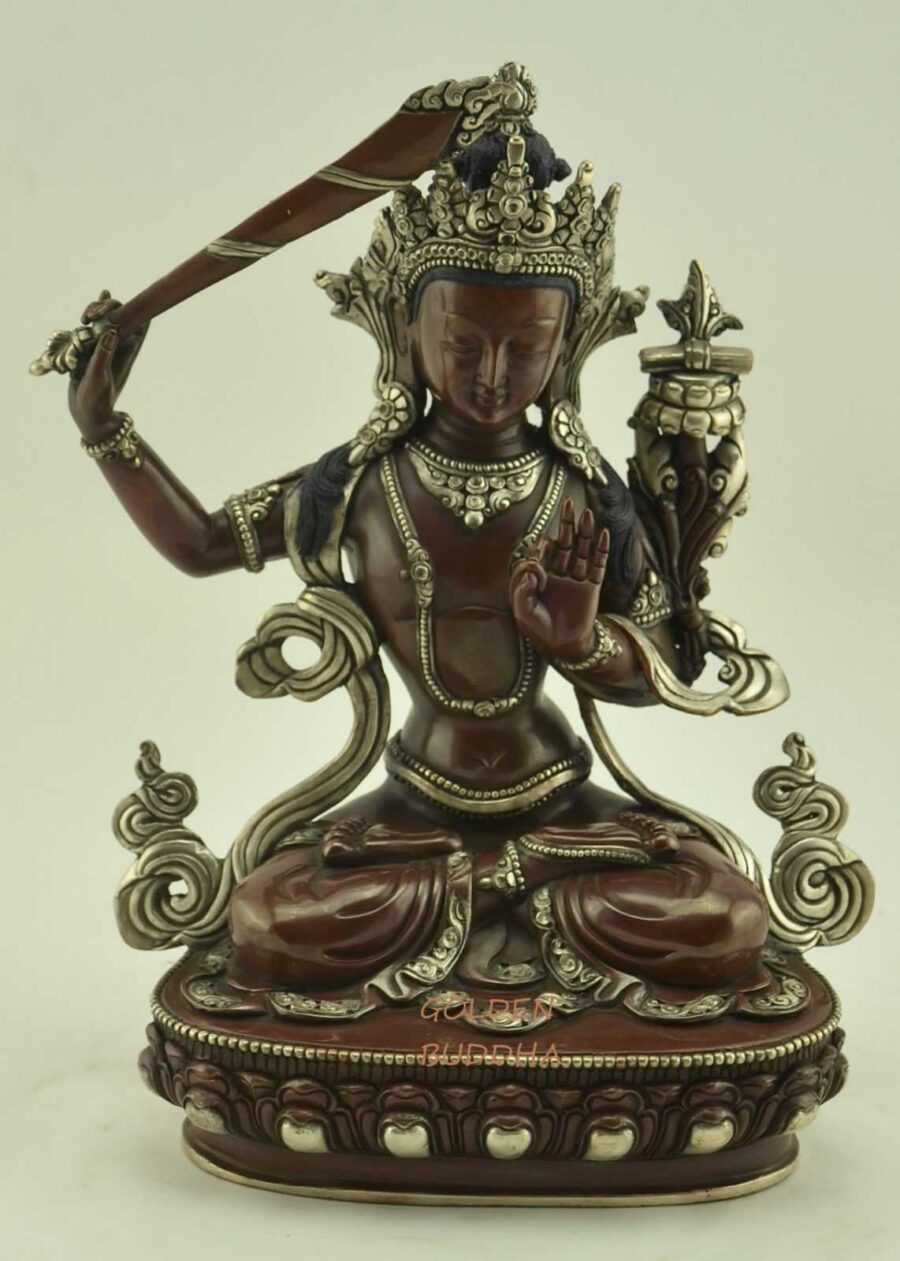 Oxidized Copper 9.75″ Manjushri Statue, Handmade, Silver Plating