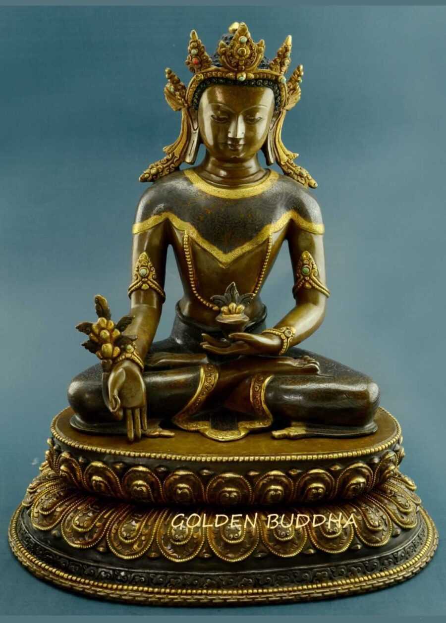 The right hand of our oxidized copper beautiful Medicine Buddha is depicting the Varada or “boon granting” mudra. The mudra is displayed with the right hand draped over the right knee. Additionally, the palm of the hand is open and facing forward. The gesture reflects the gift giving sentiment of Buddhas and bodhisattvas.