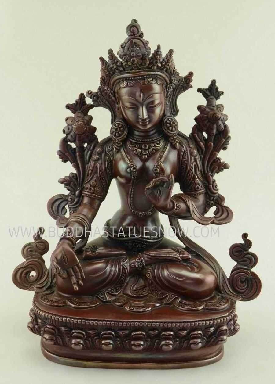 Our beautiful antiquated Cintachakra statue is one of the most popular embodiment of the Tara Bodhisattva. Indeed, she has all of the classic features – seven eyes, 2 lotus flowers and she displays important Buddhist mudras. Additionally, Cintachakra is seated in the full lotus pose on a single lotus pedestal. Our Nepali artisan gave the statue an antiquated finish with the use of oxidized copper.