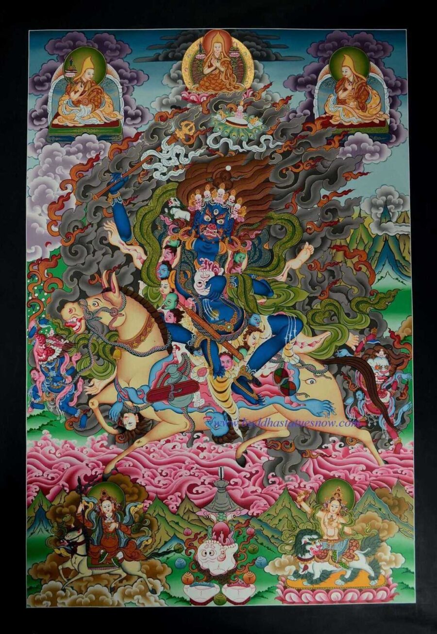 Palden Lhamo is the protector of the Tibetan government and it’s Buddhist institutions. Additionally, she is the protector of the line of Dalai Lamas. As such, she is highly regarded as a protector by the Gelug. Therefore, on top of the Palden Lhamo Tibetan Thangka painting is included a depiction of Guru Tsongkhapa and his two disciples.