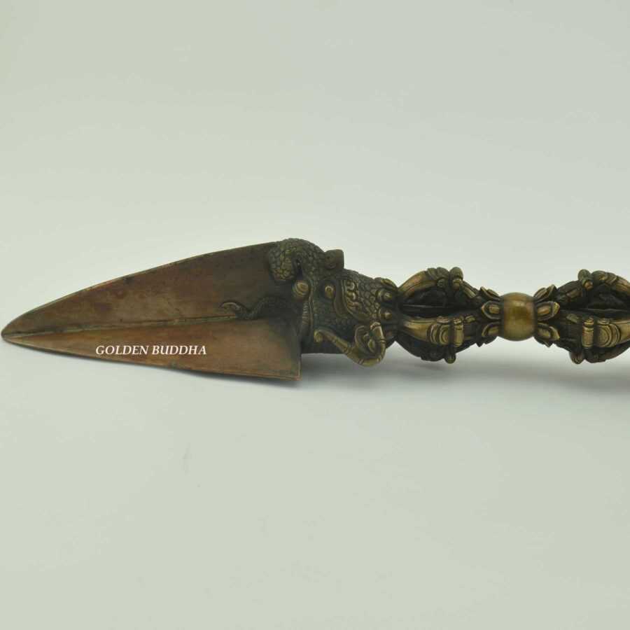 Our handmade Tibetan Phurba Ritual Dagger set is 16.5″ inches in height and features an antiquated copper finish. The item was hand carved in Patan, Nepal using the traditional lost wax sculpting method. Indeed, for many centuries the Nepali artisans have been the preferred source of Tibetan ritual items for the Tibetan monasteries. As a result, the buyer can rest assured that they have purchased an authentic Phurba Ritual Dagger set with the highest quality carving.
