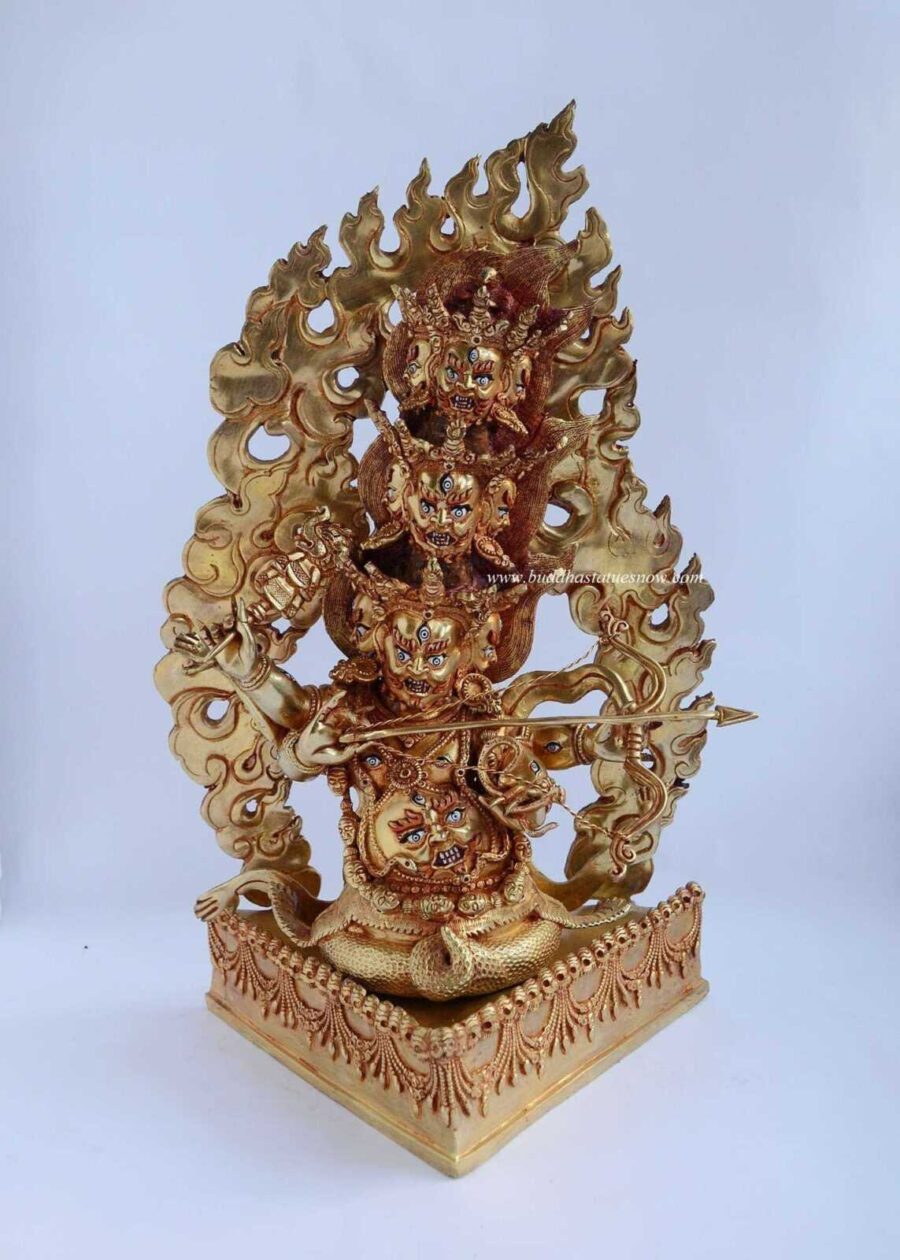Our fearsome Rahula Statue is an embodiment of a Dharmapala. A dharmapala is either a Buddha or Bodhisattva that has taken on a wrathful appearance. Additionally, the purpose is to act as the defender of the Dharma. Also, their objective is to protect Buddhist practitioners from obstacles that can impede their spiritual development. Indeed, dharmapala is a Sanskrit word that translates as “Dharma Defender”.