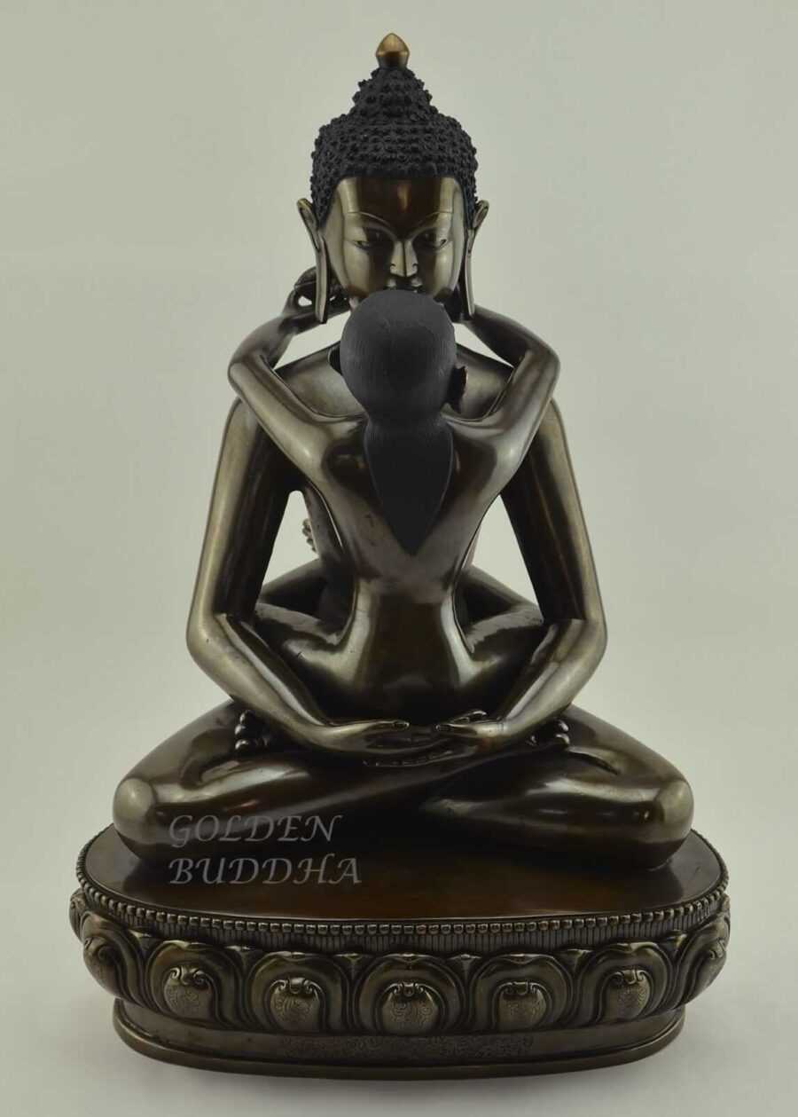 The Nyingma school of Tibetan Buddhism venerates Samantabhadra as the Primordial Buddha. Our beautiful Samantabhadra statue depicts him in sensual embrace with his consort Samantabhadri. His consort represents the feminine attribute of wisdom and he is the embodiment of compassion and skillful means. This yab yum statue is a depiction of their eternal union which is considered to be enlightenment in the Nyingma school.