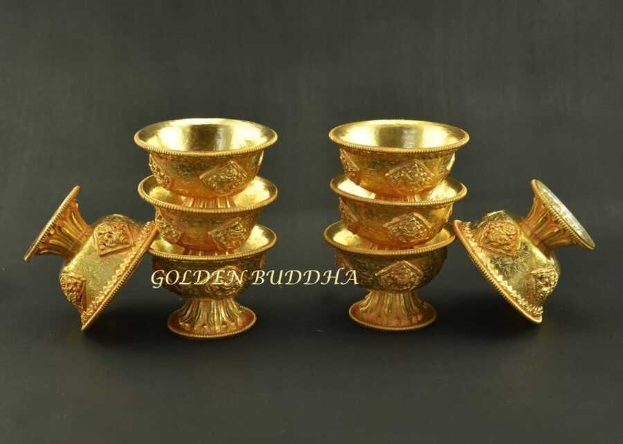 This gold plated set of eight Tibetan offering bowls includes beautiful hand engravings of the Tibetan auspicious symbols. Used in combination with the Tibetan offering ritual, the auspicious symbols will bring the blessings of the Buddhas into your home.