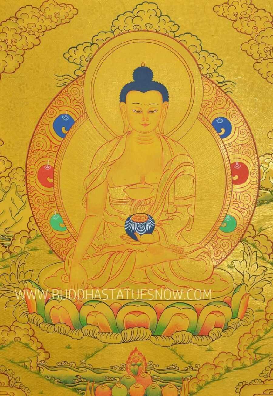 Our Shakyamuni Buddha Tibetan thangka was hand painted by traditional painters in Kathmandu, Nepal. As a result, all of our Shakyamuni Buddha thangkas can serve as religious items and also Buddhist art. Additionally, Nepal is the preferred source of thangkas, ritual items and sculptures for the Tibetan monasteries. Therefore, when you purchase this Shakyamuni Buddha Tibetan thangka rest assured it is of monastic quality.